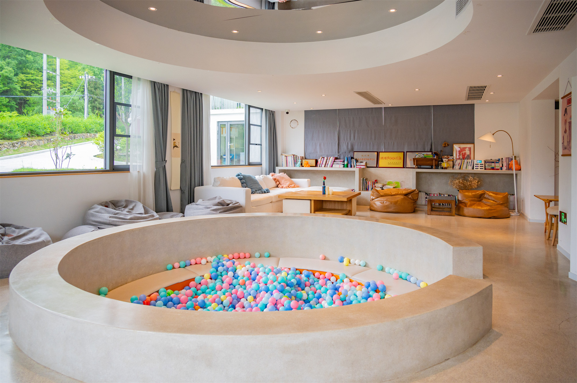 公共区域还配备了超大的无边泳池、围炉煮茶、书吧、儿童海洋球池等,可以满足不同的游客人群。
