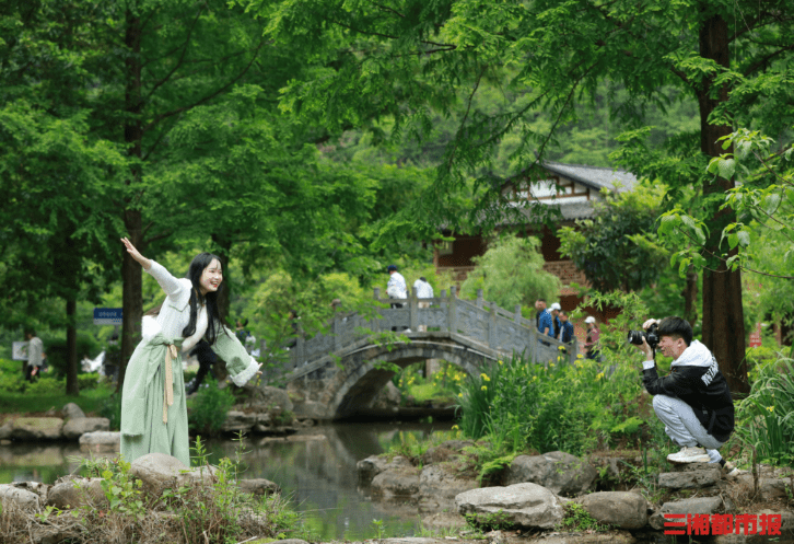 华声在线4月27日讯(全媒体记者 丁鹏志 通讯员 吴勇兵)4月27日,在张家界黄龙洞景区生态广场,游人身着民族服饰体验旅拍。当日,由黄龙洞景区和张家界辉扬旅拍联合打造的黄龙洞旅拍上线运营。