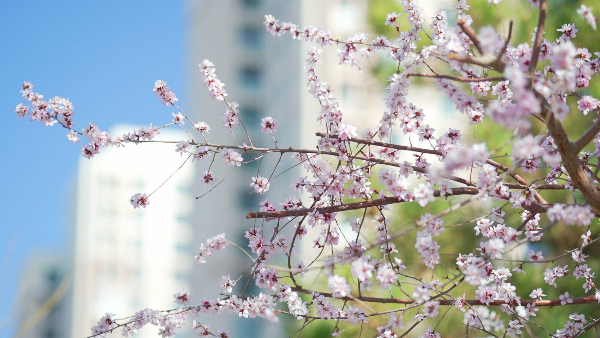 在临河市区内,大街小巷杏花、桃花、梨花盛装迎人,竞相开放,淡淡花香随风飘荡,沁人心脾,令人陶醉。(杨永旺 菅茹)