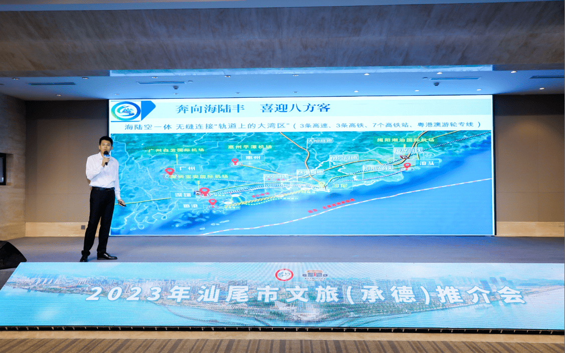 推介会上,汕尾市文化广电旅游体育局相关负责人介绍,汕尾地处广东省东南沿海,是一座“湖在城中,城中有山,山中有湖,依山傍海”的美丽滨海新城。这里既有历史悠久的人文景观,更有风光旖旎的自然资源,是海产良港、水鸟天堂、森林富山、康养福地、红色热土。汕尾的红色文化弥足珍贵,海陆丰是全国第一个苏维埃政权诞生地,中国农民运动的重要发源地之一;汕尾的蓝色滨海领秀南粤,长达455公里的海岸线,拥有 800多个海岛、岛礁,怀抱“百岛十滩九湾”。汕尾品清湖,面积达22.5平方公里,相当于4个杭州西湖,为“中国大陆第一大潟湖”,遮浪奇观红海湾,被誉为“中国观浪第一湾”,陆丰金厢银滩,堪称粤东黄金海岸,省级旅游度假区金町湾,面朝大海,春暖花开;绿色资源多彩多姿,坐拥四万亩红椎林、数百种水鸟天堂、多处优质温泉资源;文化底蕴深厚,潮汕文化、客家文化、广府文化、疍家文化交相辉映,人文旅游资源独具魅力,文化景象别具一格,拥有9项国家级、30项省级非物质文化遗产、75项市级非物质文化遗产,被誉为“中国民间文化艺术之乡”。汕尾紧邻粤港澳大湾区,交通便捷,气候宜人,年平均温度22.5℃,夏无酷暑、冬无严寒、空气清新、环境优美,四季可游,是中国滨海休闲旅游优秀目的地城市。