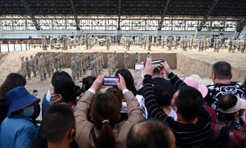 4月26日,游客在秦兵马俑一号坑遗址内参观。“五一”假期将至,秦始皇帝陵博物院已迎来节前游览小高峰,单日游客接待量超过5万人次。 新华社发