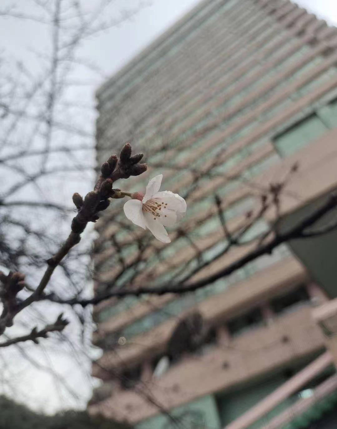 3月11日,晴川假日酒店工作人员拍到的第一朵樱花绽放。