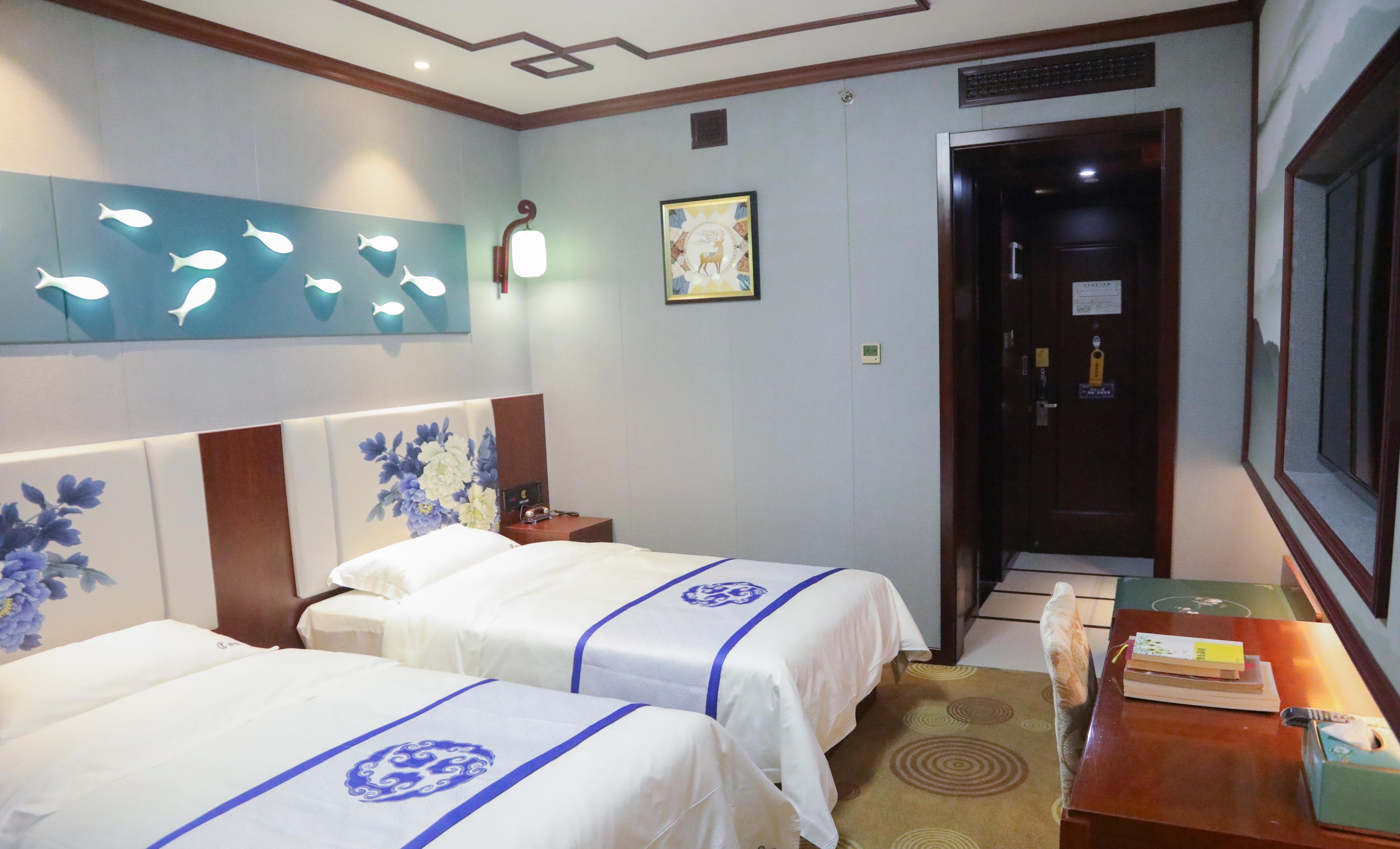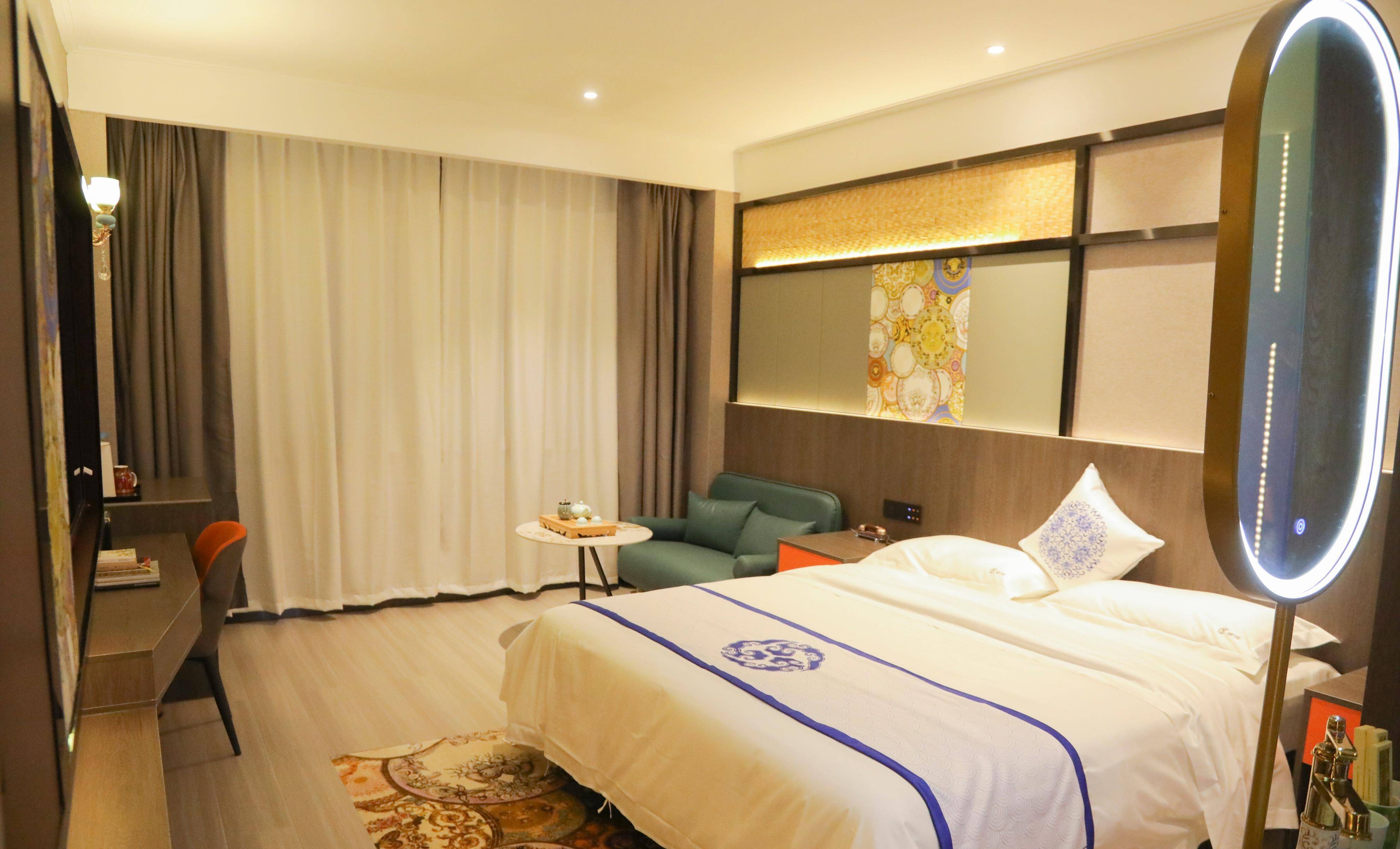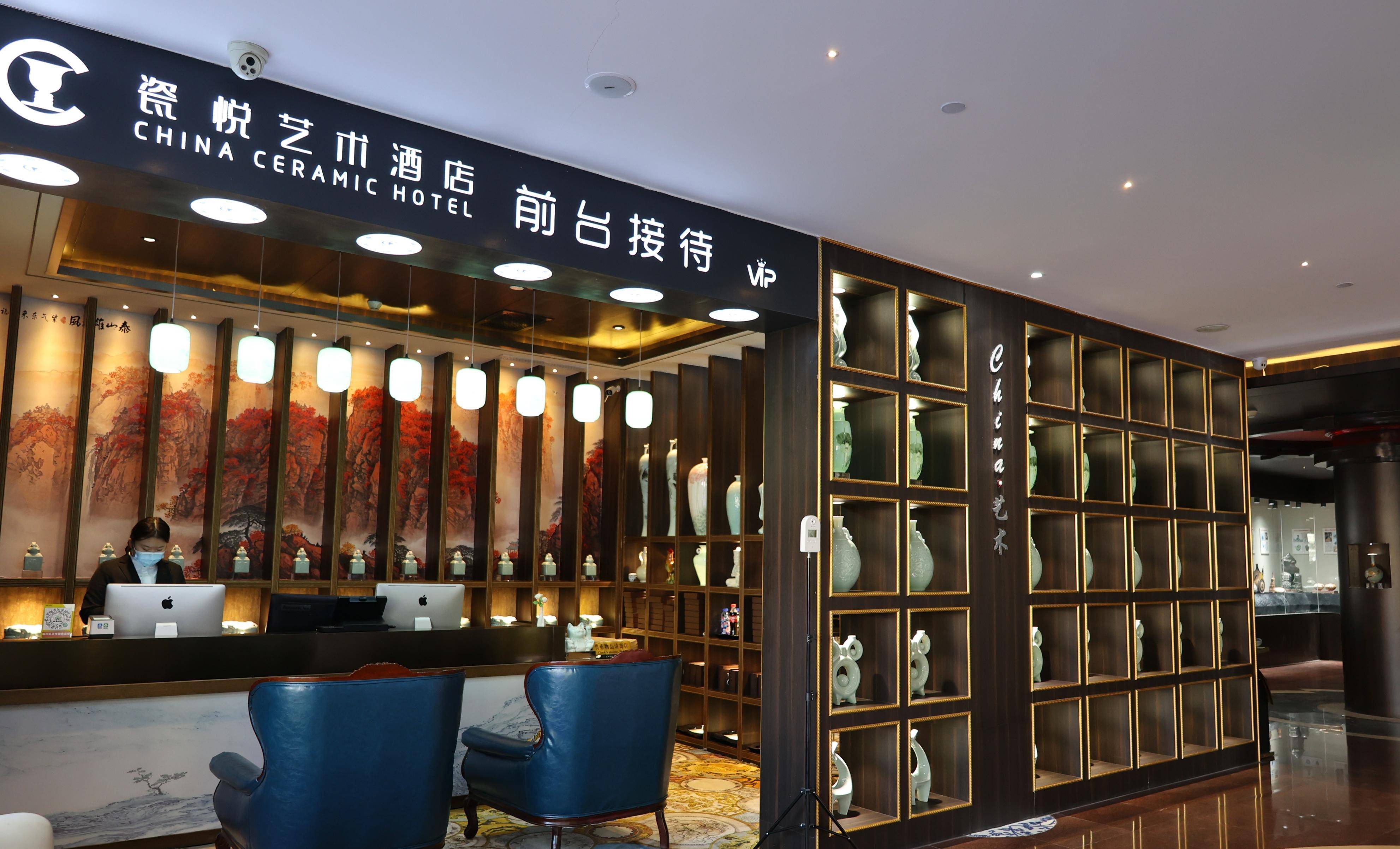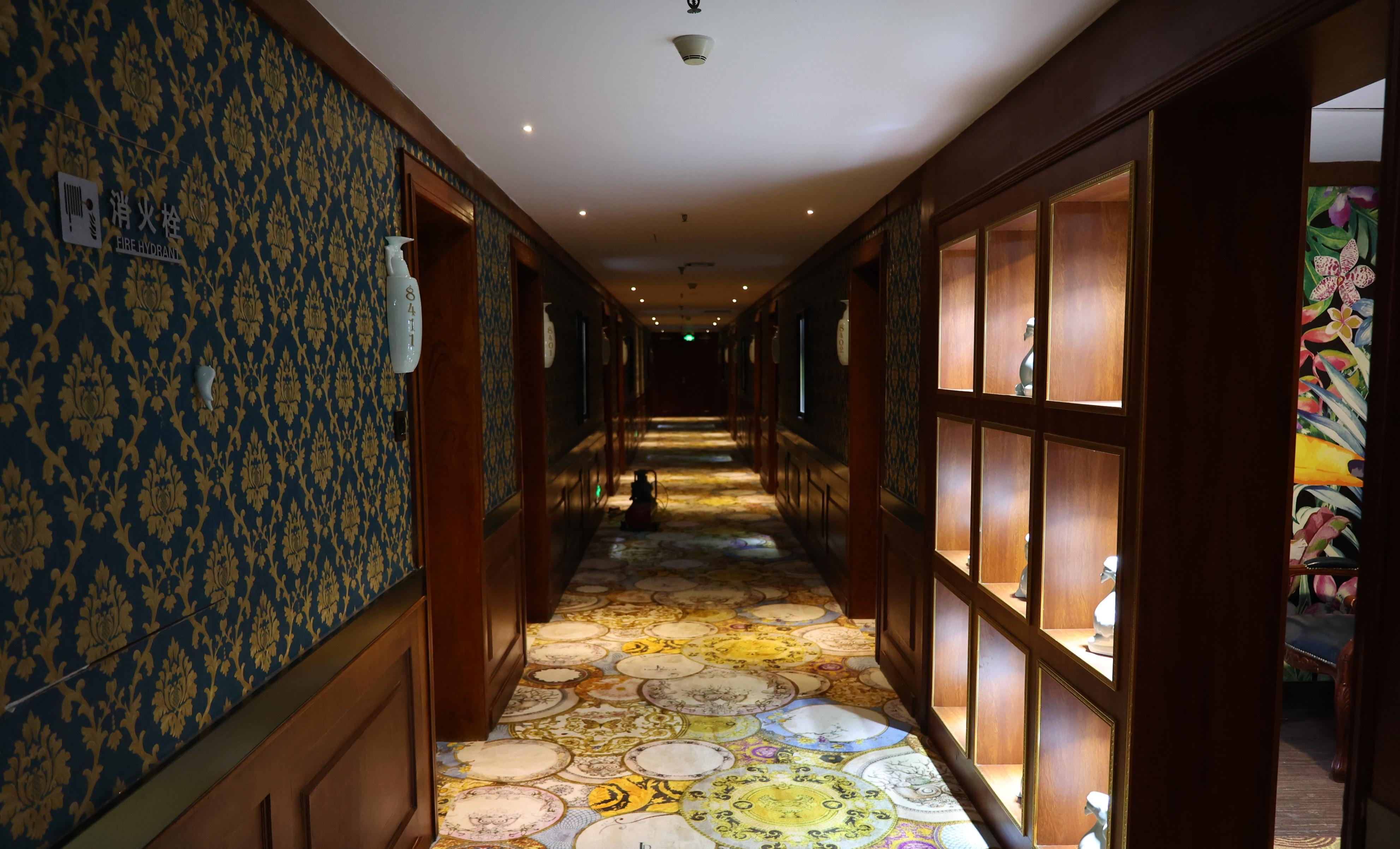 酒店三层至八层是客房区,走廊内按唐、宋、元、明、清、近现代不同时期陶瓷文化元素布置,房间号牌用陶瓷灯罩制作,宾客所用床品、洗刷用品都能体现出陶瓷文化元素。酒店各个功能区域介绍、导向牌等也都是由陶瓷盘子或陶瓷瓶制造。