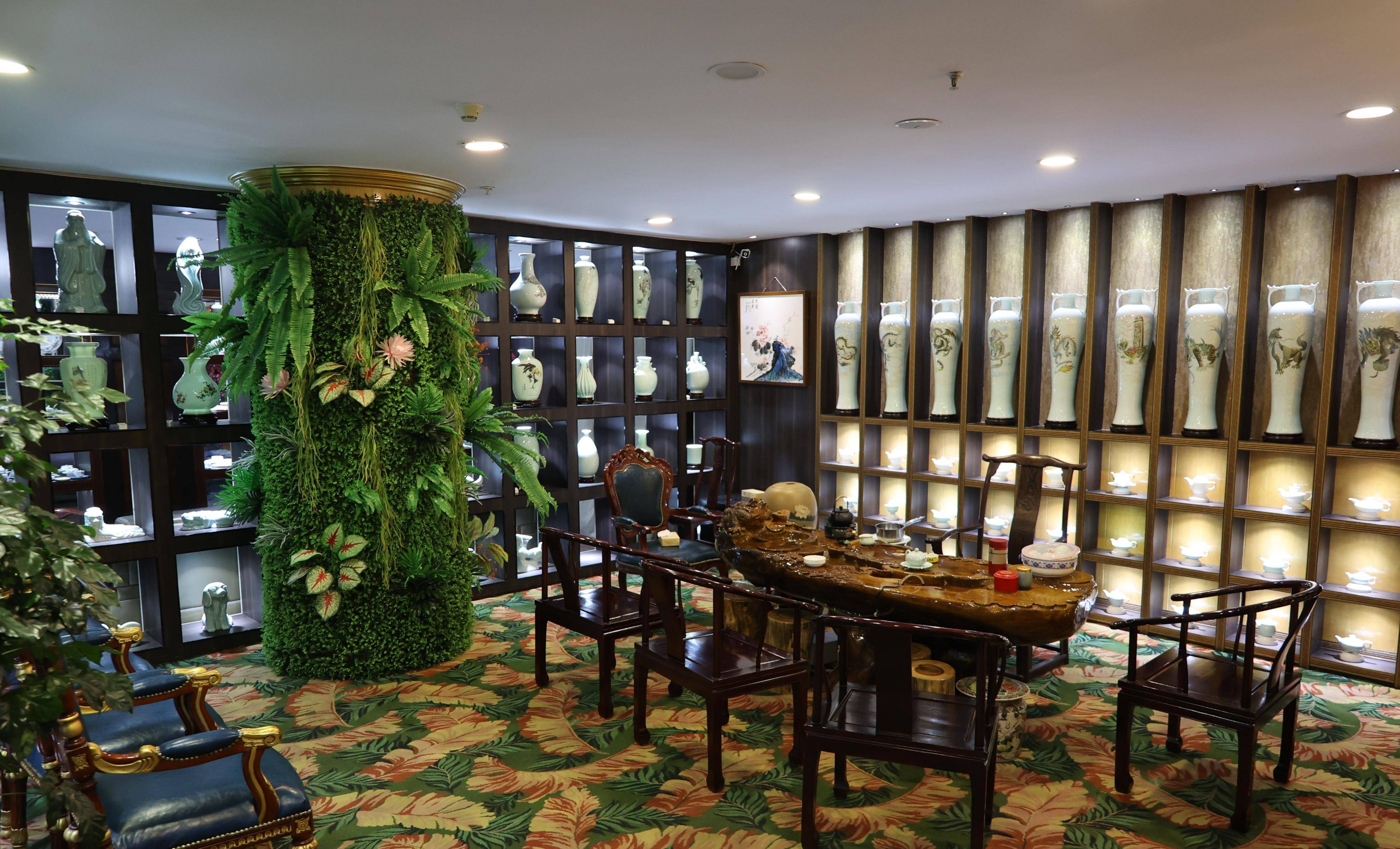 在国瓷展区里侧,是一个陶瓷文化与茶文化结合的茶室,茶室背面是由山东陶瓷艺术大师周建华设计创作的9个天龙瓶,意喻九龙生子,人丁兴旺;茶室左侧是鲁青瓷展示区,陈列着国家级非遗项目重点保护品种、具有1400年烧制历史的鲁青瓷;茶室右侧是由山东陶瓷艺术大师周建华手工绘制的《水浒传》英雄谱,是由108个鲁青瓷瓶组成,将鲁青瓷儒家文化与茶文化融为一体,彰显中国传统文化博大精深。