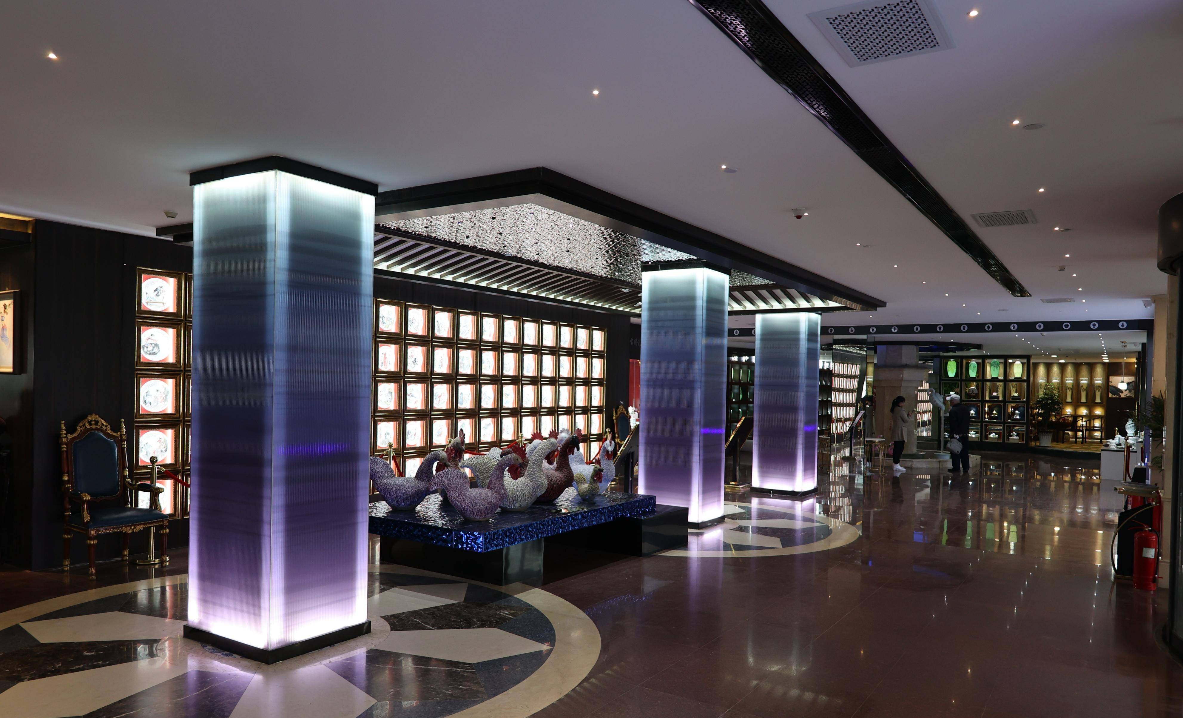 一楼大堂左侧,展橱内陈列着世界各国陶艺家陶艺精品及陶艺家简介与作品介绍。右侧,是中国国家用瓷展示区,展示了国瓷泰山历年来生产的国家礼品用瓷、国家重大外交活动用瓷、国家招待用瓷,另外还有国内知名陶瓷艺术大师专为酒店设计的艺术作品,也有国瓷泰山的各类经典作品,在灯光的映射下,美轮美奂让人沉醉其中。