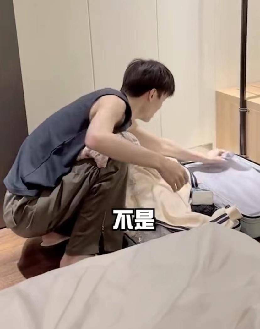 男友正蹲在行李箱前面,仔细收拾行李,女子在身后看着,开始撒娇地哭诉:怎么办呀,老公,明天去迪士尼玩,我穿什么呀?