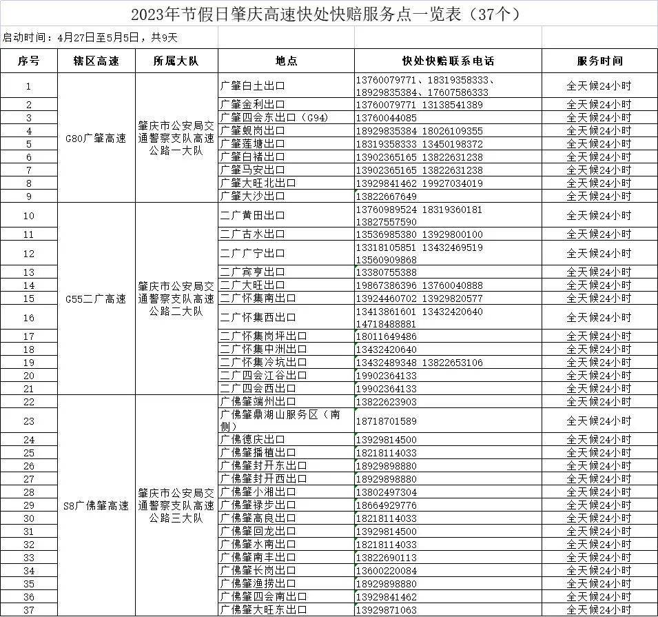 2023年节假日肇庆高速快处快赔服务点一览表(37个)