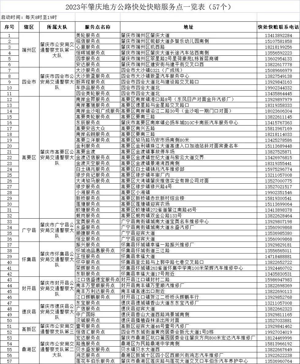 2023年肇庆地方公路快处快赔服务点一览表(57个)