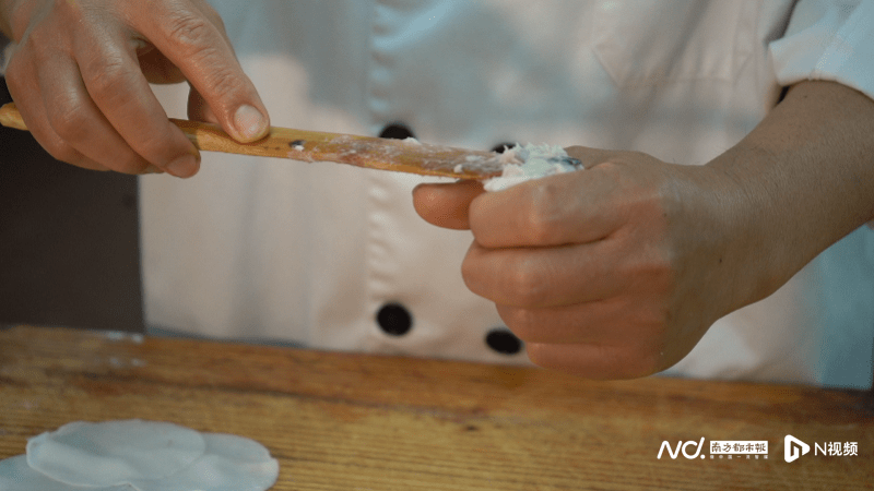 澄粉和生粉按照1:1的比例备好。加入1.5倍的开水烫熟澄粉,再加入生粉,搅拌均匀,揉至顺滑。将面团切分成均匀的小块,以保证每个市桥白卖的大小统一,再用刀擀成面皮,相比擀面杖,刀推出的面皮更薄。