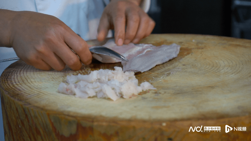 市桥白卖制作的关键在鲮鱼肉的处理,用铁勺将鲮鱼肉一点点刮下,按照顺时针方向搅拌成鲮鱼泥。调味也有讲究,首先要放盐,带出鲮鱼肉的胶质;其次加入定量的糖、味精、陈皮、胡椒粉等调味料,反复搅拌、摔打。处理好的鲮鱼肉需要放置冰箱冷藏一小时,使得肉质更加爽口弹牙。