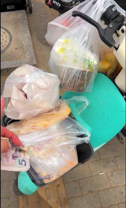 这些东西加起来一共95块钱,100块钱还剩下5块钱;结果买了这么大一堆吃的。