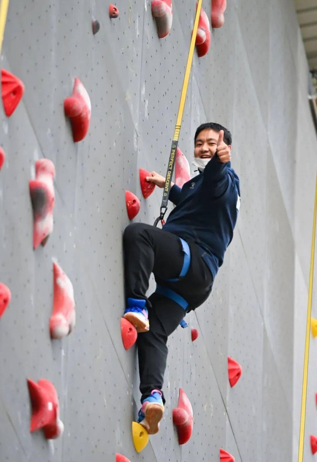 身处群山环抱的环境中,平时习惯了旁观的媒体记者,跃跃欲试,一攀为快。手脚并用、步步攀登,看似简单的动作,让在场的记者面露难色,深深体会到了健步如飞的攀岩健儿日常训练的各种艰辛。“第一次上岩壁,我在上面犹豫了5分多钟不敢下来,最后是教练穿上装备把我接下来的。”面对犹豫的媒体朋友,山东省攀岩队队员们鼓励道:“没问题的,抓紧了大胆往上攀就行,到达岩壁的最高处还能一览黑虎山的别样风光。”