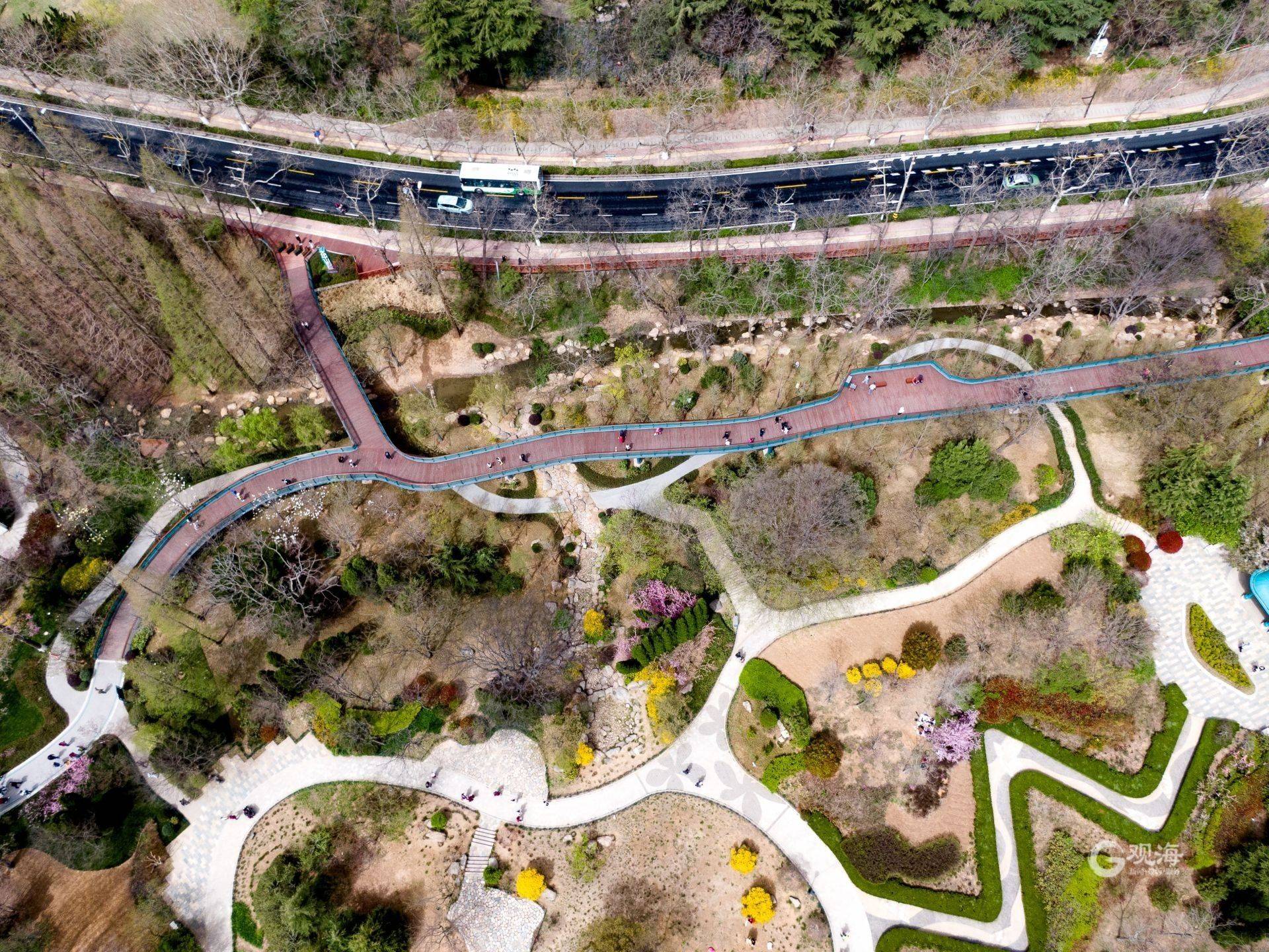 延安一路附近,太平山中山公园区域原先的隔离围栏已经拆除,让公园与城市无界相融;内部景观桥景致旖旎,吸引不少游客前来打卡。