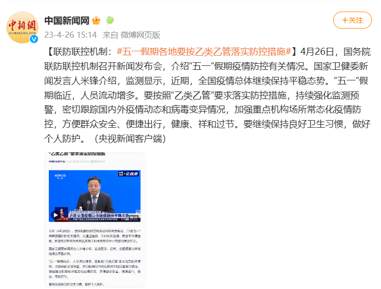 国家卫健委新闻发言人米锋介绍,监测显示,近期,全国疫情总体继续保持平稳态势。“五一”假期临近,人员流动增多。要按照“乙类乙管”要求落实防控措施,持续强化监测预警,密切跟踪国内外疫情动态和病毒变异情况,加强重点机构场所常态化疫情防控,方便群众安全、便捷出行,健康、祥和过节。要继续保持良好卫生习惯,做好个人防护。