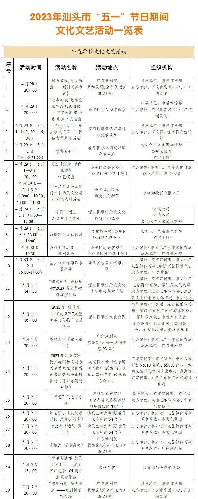 近日,记者从有关部门获悉,为了让广大来汕游客和本地群众感受潮汕文化魅力和城市活力,汕头市整合多方资源策划推出一系列“五一”文化文艺活动。节日期间不仅将一如既往做好交通出行保障,还将推出多项惠民便民措施,把实事办到群众的心坎上。