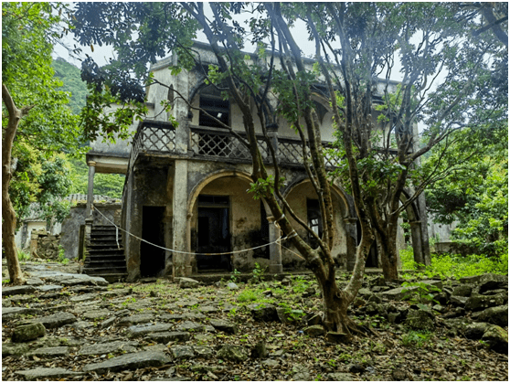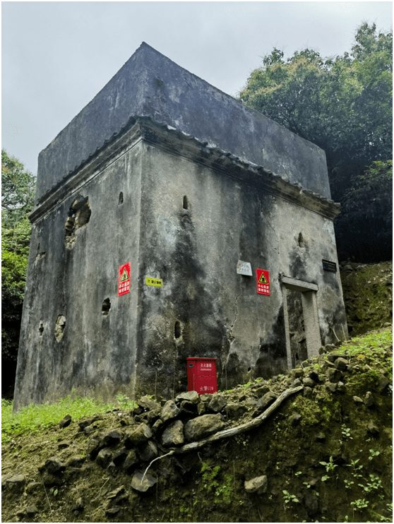 再往上走接近村口位置有一座碉楼,是昔日守护村落的一道防线,建于民国时期。据说旧时这一带常有倭寇、山贼、海盗出没,为了防止“打明火”,村民在村外围围铁丝网,铁丝网开三个门以供进出,村里会成立联防队日夜值守,民国时期村民拥有很多枪支弹药,每个射击孔都有人把守,防范山贼、海盗入侵,保护村落、村民生命财产的安全。