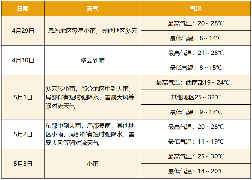 预计2023年五一假期(4月29日-5月3日),我省先晴后雨,气温有起伏。其中,4月29-30日,多云、恩施地区有零星小雨;5月1日夜间-3日,全省有一次对流性降水过程,局地伴有短时强降水、雷暴大风等强对流天气。