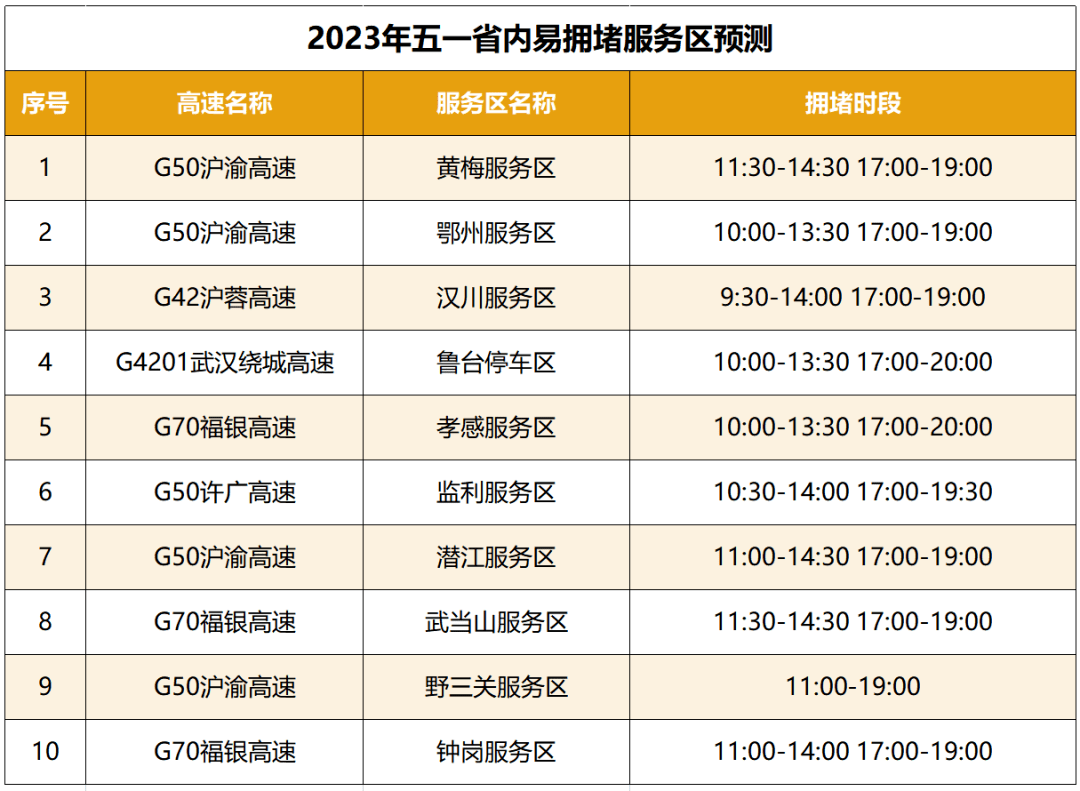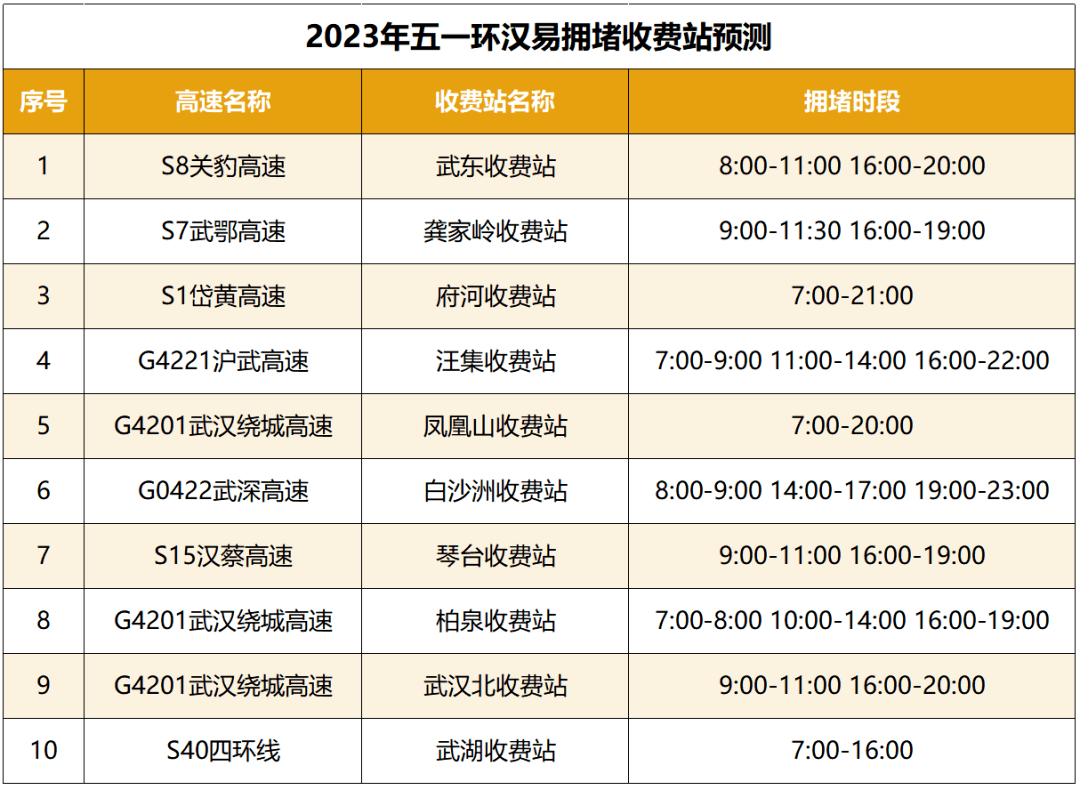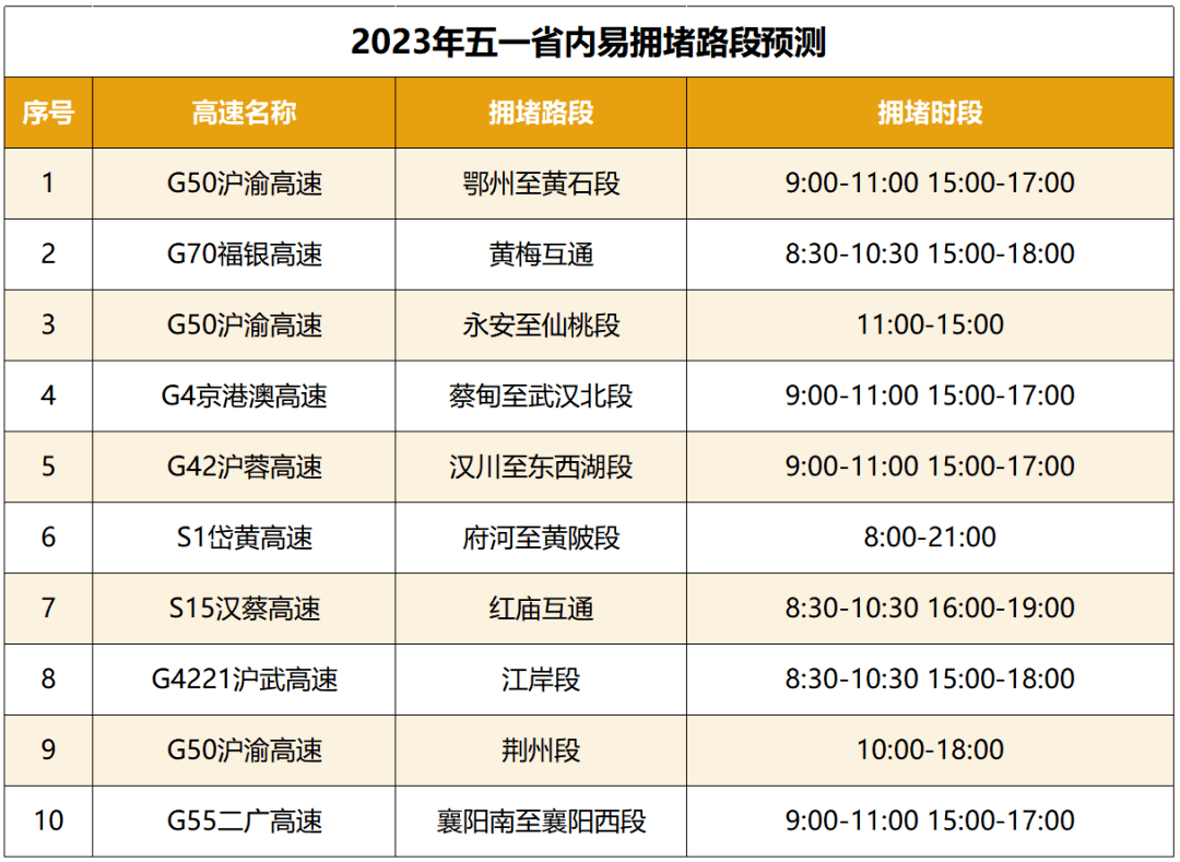 进出城通道、景区周边道路,以及收费站、服务区、互通立交、桥梁、隧道、施工路段等节点,极易出现排队缓行甚至局部严重交通拥堵,尤其是环武汉周边的沪蓉、沪渝、福银、京港澳、岱黄、武鄂等高速拥堵风险高。