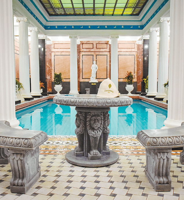 和过去一样,澡堂里有俄式餐厅,除公用的男宾和女宾休息厅外,还有各种风格的独立洗浴厅,如苏联厅、堪察加厅、罗马厅、贝加尔厅和商贸厅,客人像选酒店房间一样租用即可。每个厅都有桑拿房、泳池、客厅和卧室。莫斯科居民瓦莲京娜说:“塑料拖鞋、床单和浴帚在浴池里能领到,建议来的时候自带浴帽,需要的话带上浴袍。饮用水可以自带,也可以在迷你吧台取用,那里价格不贵。我们点了茶、鱼子酱煎饼和鲑鱼煎饼、蜂蜜。”