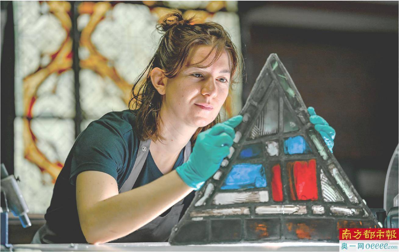 工作人员对巴黎圣母院的彩绘玻璃花窗进行修复。