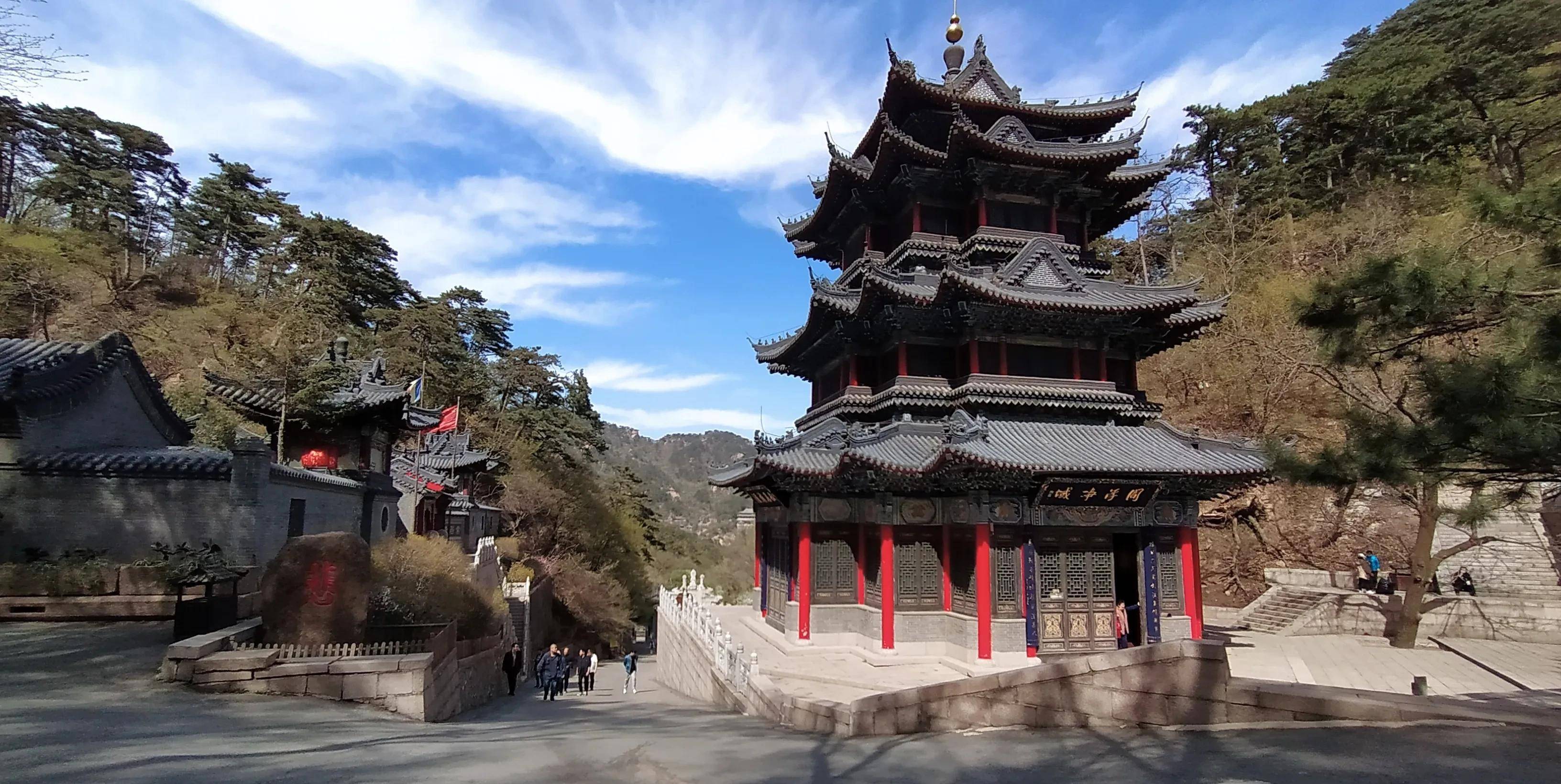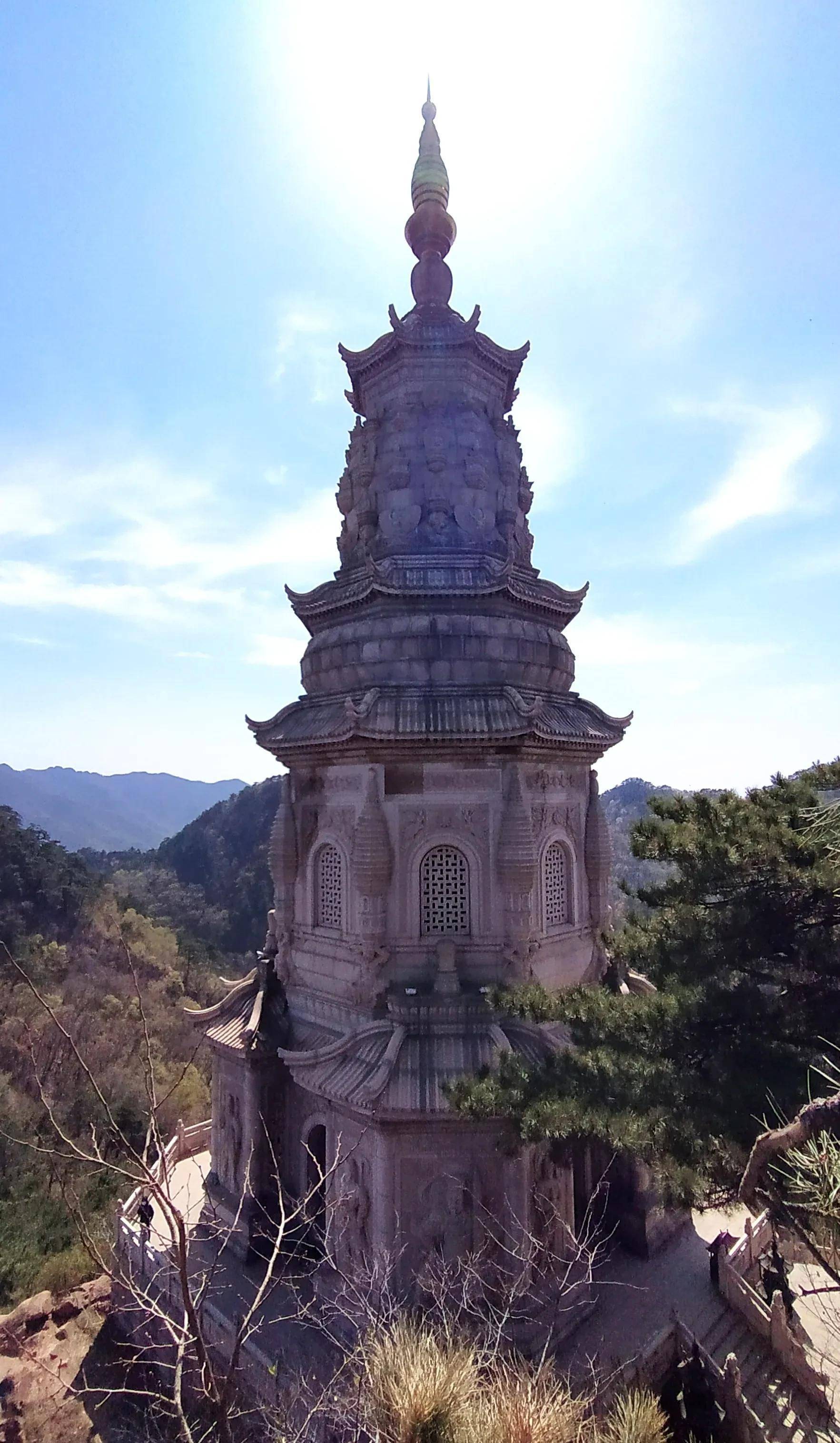 圆通观的后山门,我也是第一次来。坐在台阶上稍事休息后,看路标指示牌,发现这里距离弥勒宝塔仅有半公里。这时是12:50,我们上车集合时间是15点,我算了一下,节奏快点时间应该可以够,于是我决定向大佛景区出发。