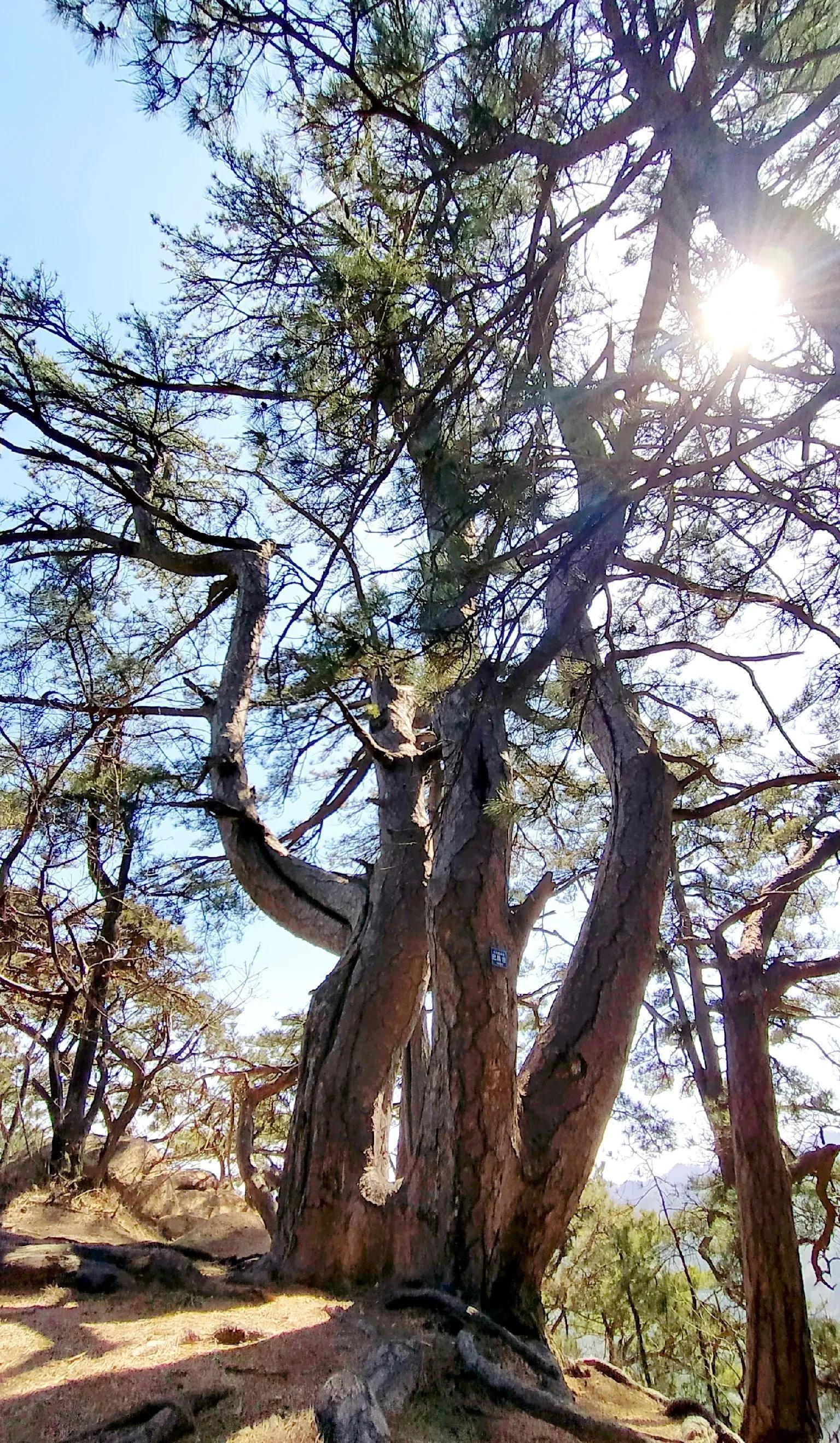 走了一个半小时左右,到达了今天的目的地附近。左侧是一棵古松,也是棵奇松,树干离地一尺多高后分出三个主干,每个主干都有一抱多粗,而且可喜的是古树枝叶繁茂,树冠庞大。真不知这棵古松有多大年纪了,我想至少有1000岁了吧!