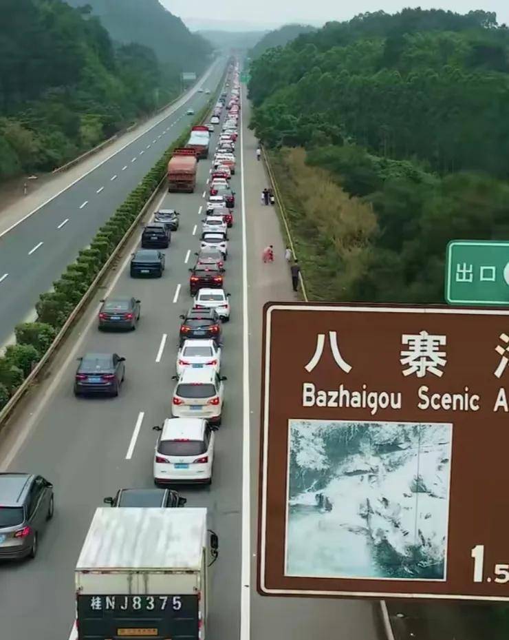 然而,受限于八寨沟风景区承载能力,今天很多游客都被堵在高速路上,无法下高速,不少人只能开去上思,可谓败兴而归。