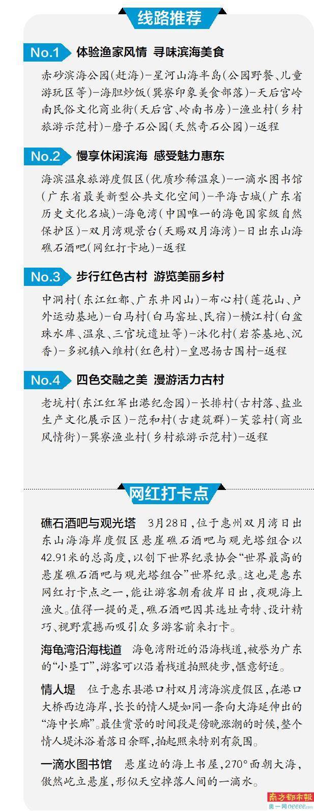 为更好地引导旅游业发展,顺应市民群众旅游休闲消费体验新需求,在3月的旅游推介会上,惠东还发布了春夏精品主题旅游线路。四条主题旅游线路“体验渔家风情,寻味滨海美食”、“慢享休闲滨海,感受魅力惠东”、“步行红色古村,游览美丽乡村”、“四色交融之美,漫游活力古村”,能让各地游客领略到惠东精心打造的文化旅游风情走廊,感受到别样风情。