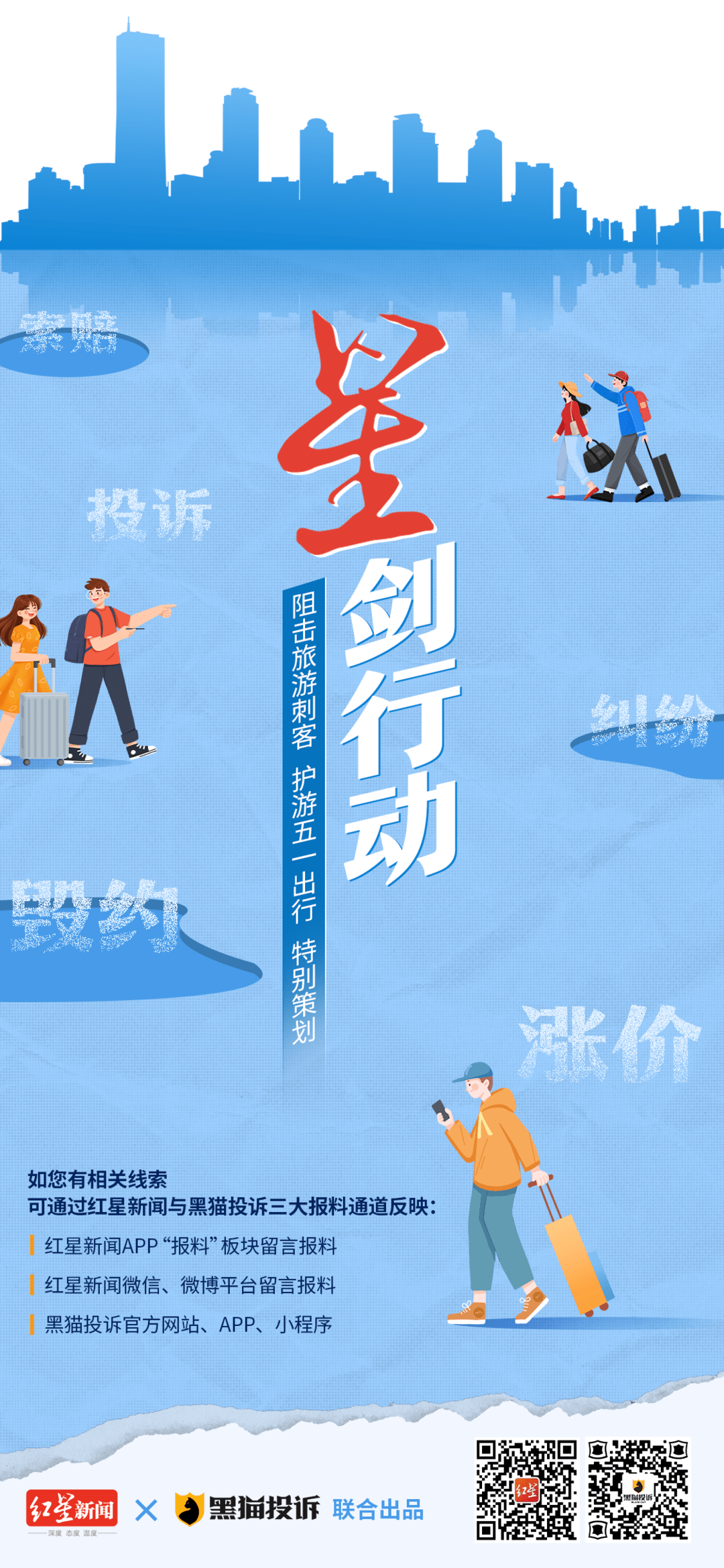 为守护旅游消费者合法权益,助力全国旅游市场规范复苏,红星新闻与新浪旗下消费者投诉平台“黑猫投诉”联合推出“‘星’剑行动——阻击旅游刺客,护游五一出行”特别策划,以黑猫投诉和红星新闻为报料平台,广泛关注人们五一出游中遇到的问题、套路、欺诈、陷阱等,对其进行曝光和追踪解决,助消费者合法维权,让消费者安心出游。