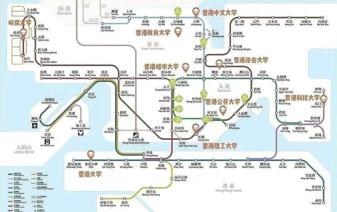 我们通过地铁线路来看下各所高校的位置,从深圳的通关口岸进入香港,乘坐香港地铁,就能到达大多数我们想去的地方。