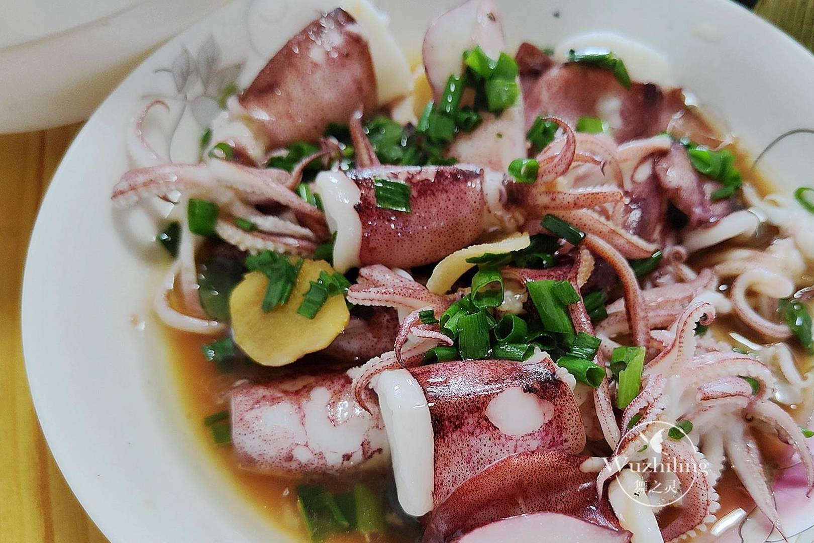 【葱油蒸鱿鱼】鱿鱼要清蒸最好选择个头不要太大的,2个手指那么就最好,水开放入蒸几分钟,浇热油,淋蒸鱼豉油和香葱,一家人特别爱吃,上桌马上就吃个精光了。