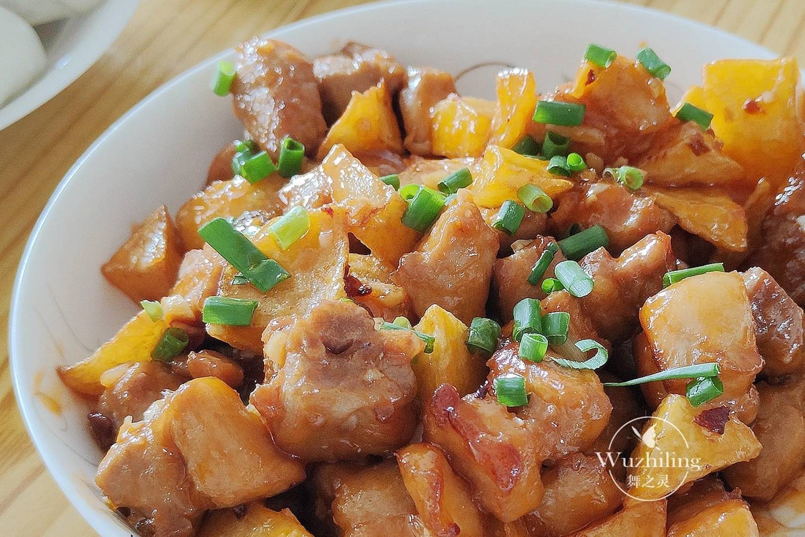 【荔枝肉】这也是妈妈爱吃的,也是妈妈的拿手菜,我们几个子女和我们的孩子也都是吃这道菜长大的,用里脊肉和土豆炸,接着准备料汁:糖香醋生抽蚝油鸡精和番茄酱少许的水放入锅里煮,淋淀粉最后放入肉裹匀。