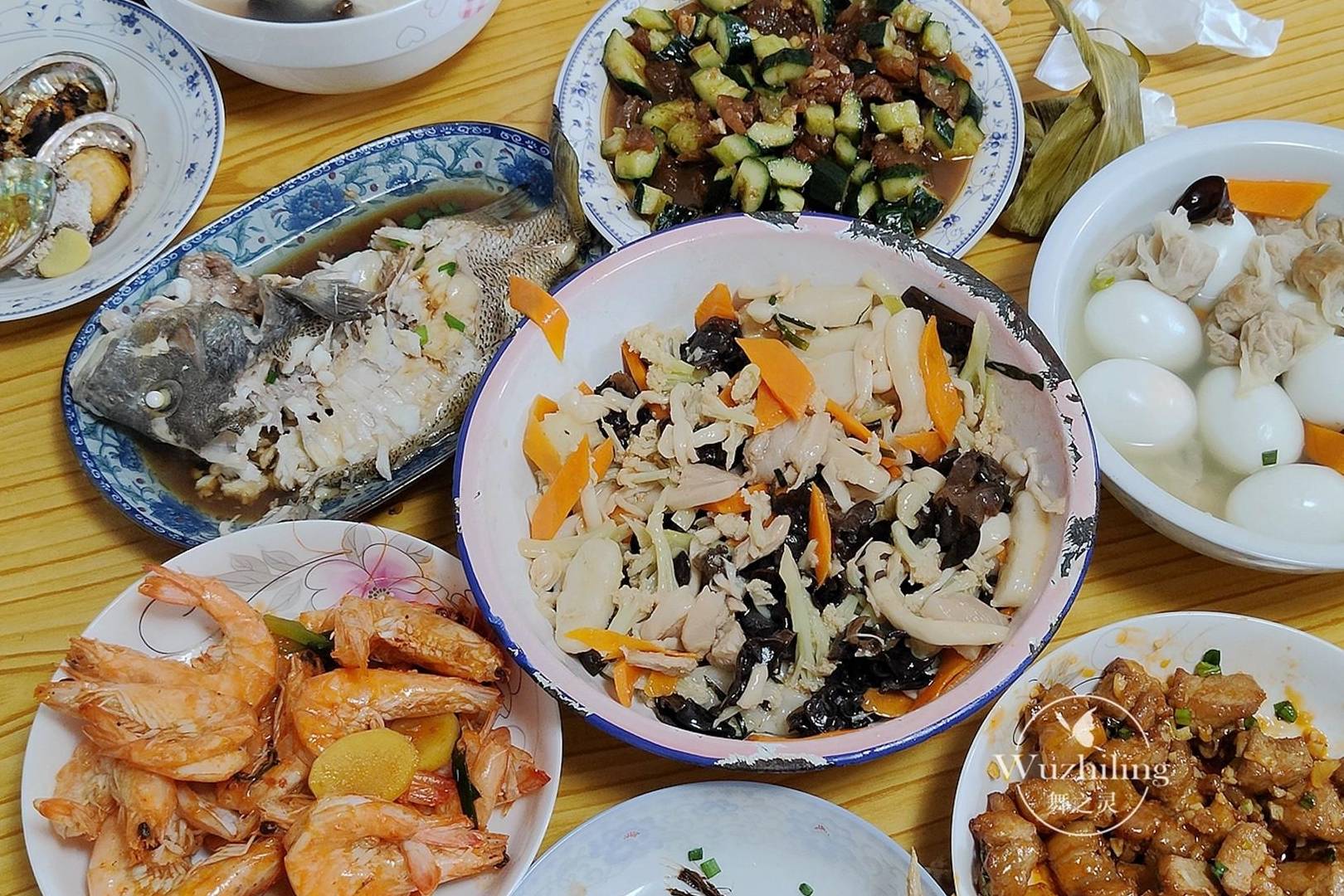 今天的家宴部分,一些海鲜菜是后面做的,有【葱油鱿鱼】、【福州太平燕】、【福州鱼丸】、【花菜炒白果】、【荔枝肉】、【糖醋黄鱼】【肉粽】、【福寿包】、【凉拌海蜇头】、【白灼花螺】等等。