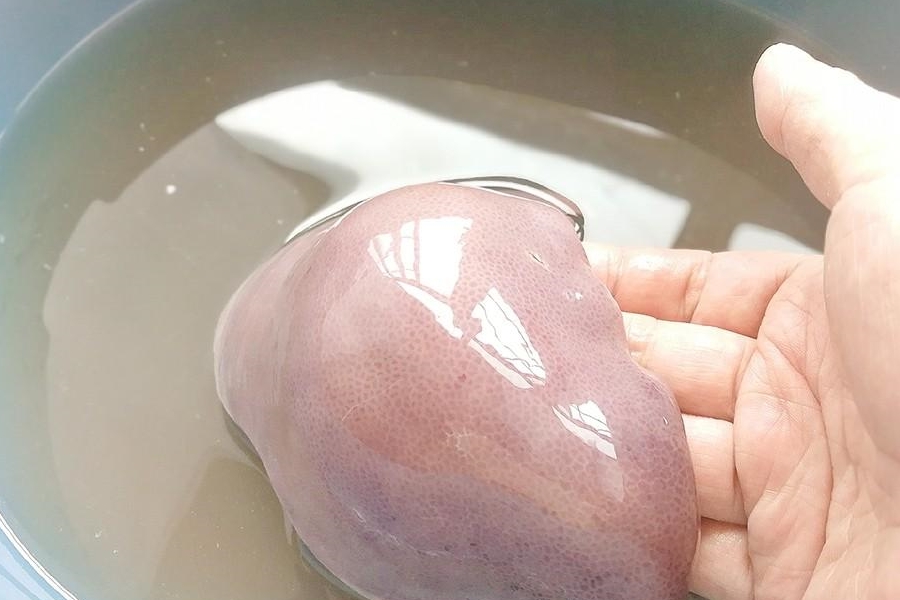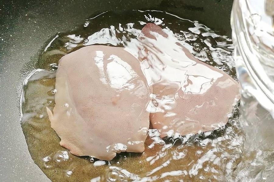 第一步,猪肝一定要选用新鲜的,先将猪肝放入盆里,倒入没过猪肝的清水,提前浸泡3个小时以上,泡到猪肝肉色发白为止,期间可以换两遍清水,泡好后的猪肝再仔细冲洗干净残留的血渍。