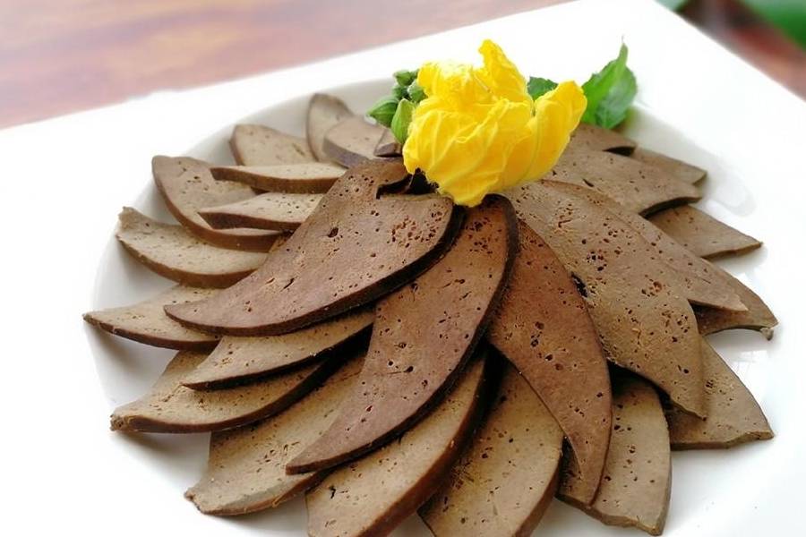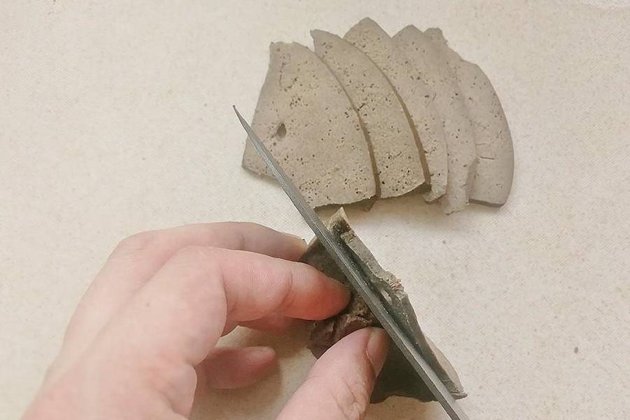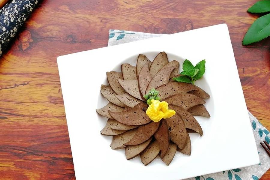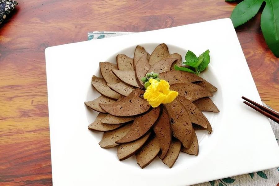 第六步,吃之前取出猪肝,用刀将其均匀地切成薄片,摆在盘子里端上桌就可以食用了。