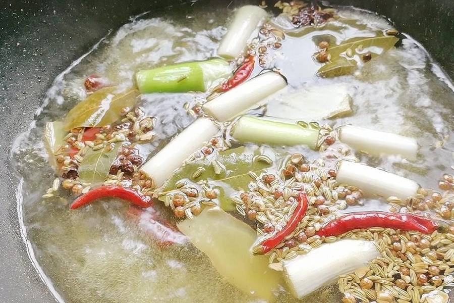用料:花椒2克,八角3克,香叶2克,小茴香3克,桂皮2克,干辣椒1克,黄酒1汤勺,大葱1根,老姜1块,盐适量。