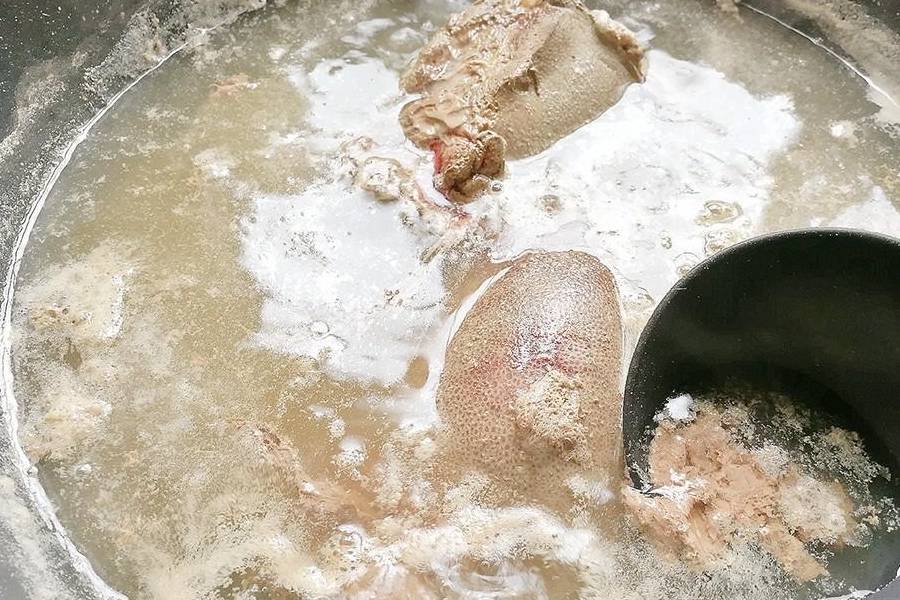 第三步,煮到猪肝不再往出冒血丝,说明猪肝也已经变熟了,如果不放心可以掰开一块看里面是否熟透,再决定要不要接着煮,煮好后捞出猪肝清洗沥干。猪肝比较嫩,很容易煮老,在整个煮的过程中要一直保持中小火,煮出来的血沫要及时地撇干净。