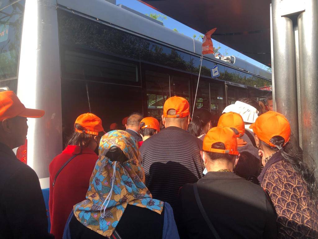 好不容易等到游客都上了车,隔着车窗一看,红帽子、红马甲,车里已经是红彤彤的一大片,几乎占满了车厢。临近晚高峰,站台上不光有游客,很多市民陆续来乘公交车回家。看着眼前这通乱,一些人无奈只好再等下一辆车。