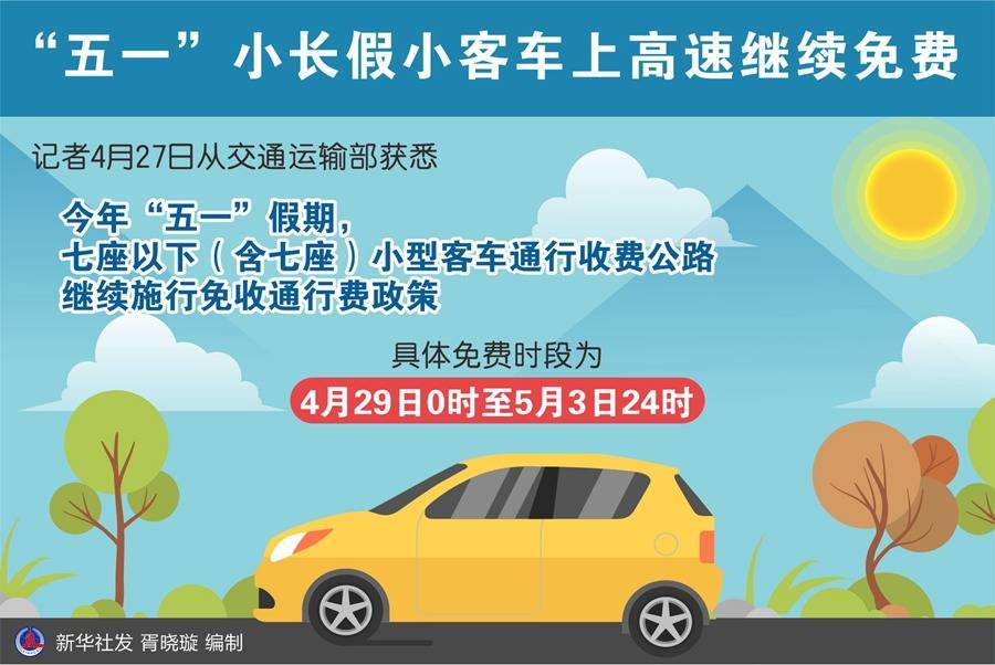 “五一”假期临近。记者27日从交通运输部获悉,今年“五一”假期,七座以下(含七座)小型客车通行收费公路继续施行免收通行费政策,具体免费时段为4月29日0时至5月3日24时。
