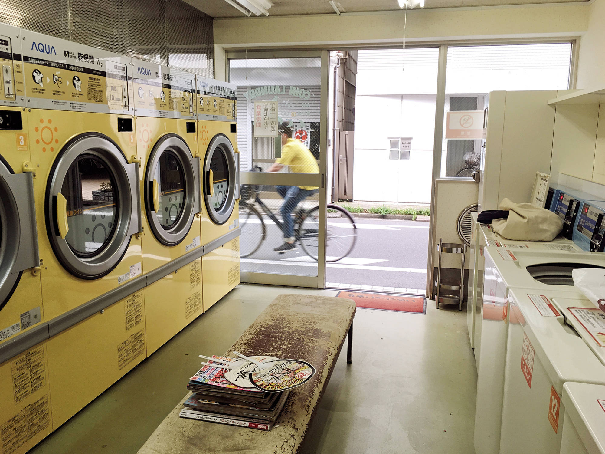 投币式洗衣间内景, 翻翻杂志, 看看来往的路人(摄影:吉井忍)
