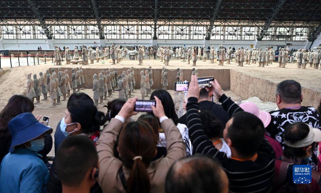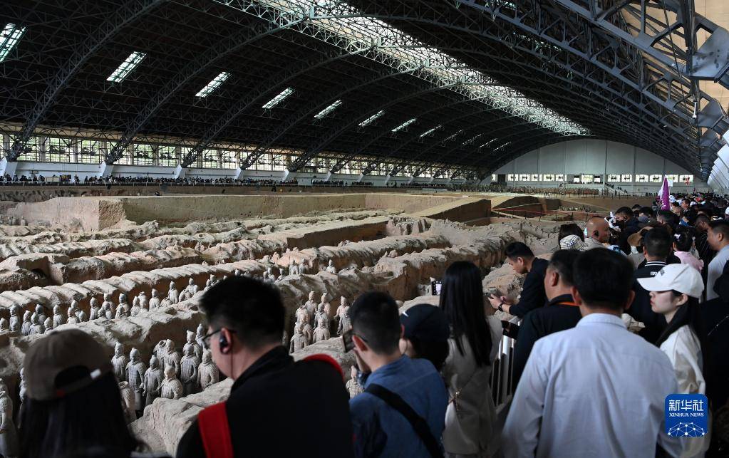 4月26日,游客在秦兵马俑二号坑遗址内参观。“五一”假期将至,位于陕西省西安市临潼区的秦始皇帝陵博物院已迎来节前游览小高峰,单日游客接待量超过5万人次。新华社发(邹竞一 摄)