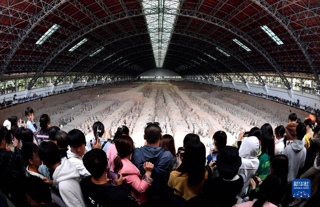 4月26日,游客在秦兵马俑一号坑遗址内参观。“五一”假期将至,位于陕西省西安市临潼区的秦始皇帝陵博物院已迎来节前游览小高峰,单日游客接待量超过5万人次。新华社记者 刘潇 摄