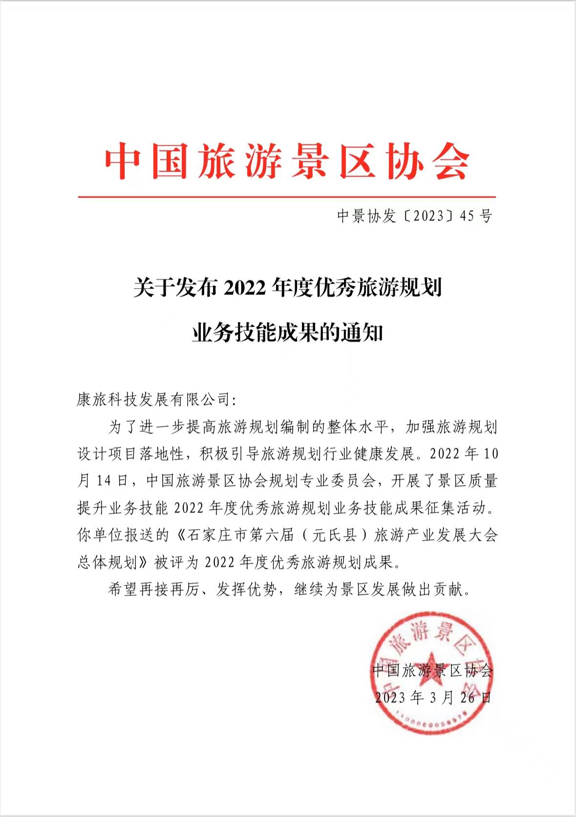 康旅科技规划咨询分院优秀成果《石家庄市第六届 (元氏县)旅游产业发展大会总体规划》因较高的旅游规划编制整体水平,对引导旅游规划行业健康发展有积极影响,经过层层选拔,入选中国旅游景区协会“2022年度优秀旅游规划业务技能成果”。