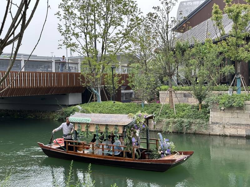 靠近烟雨廊桥的一段河道,受上游开闸影响,时有浮萍飘来,飘久了河水容易富营养化,因此,每天都要有人打捞。而整个项目包括23万平方米绿地,5万平方米商业和3公里风貌河道,有诸多细节需要更加精细的运营管理,河道飘萍只是九牛一毛。