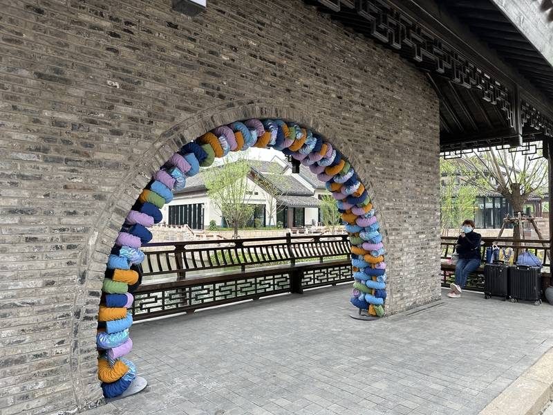 蟠龙天地亭台楼阁,随处可见彩色编织艺术装置。“它们的灵感源自手工编织,历史上蟠龙镇编织工艺很发达,是当地的民俗特色。”工作人员介绍,蟠龙天地要打造成可以走进和互动的文化场景,定期举办活动推广江南文化。