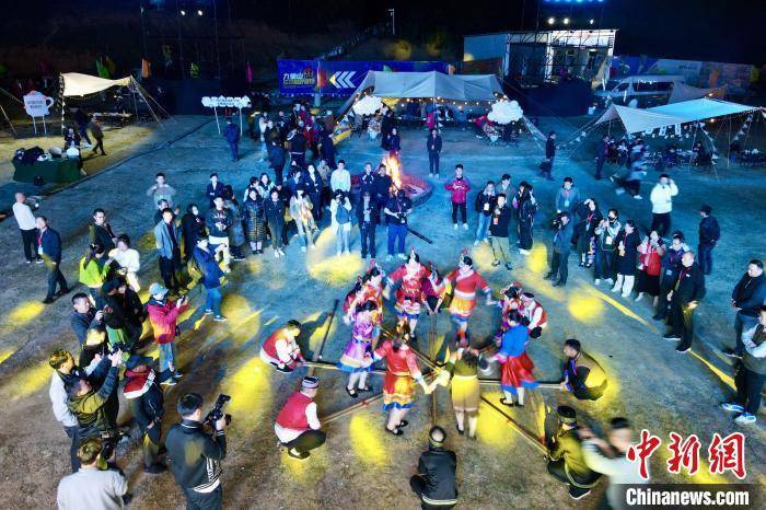 夜幕降临,欢快的竹竿舞引游客围观。 主办方供图