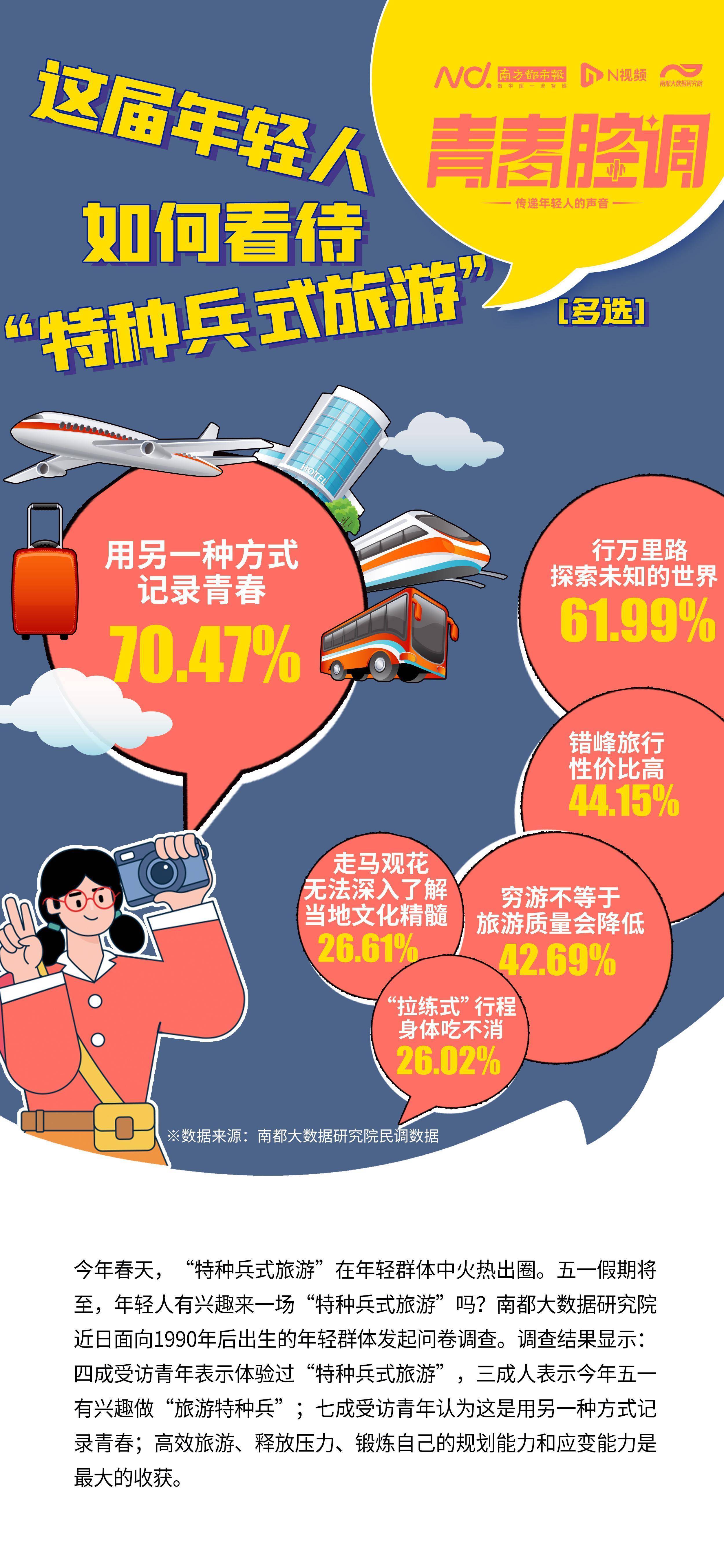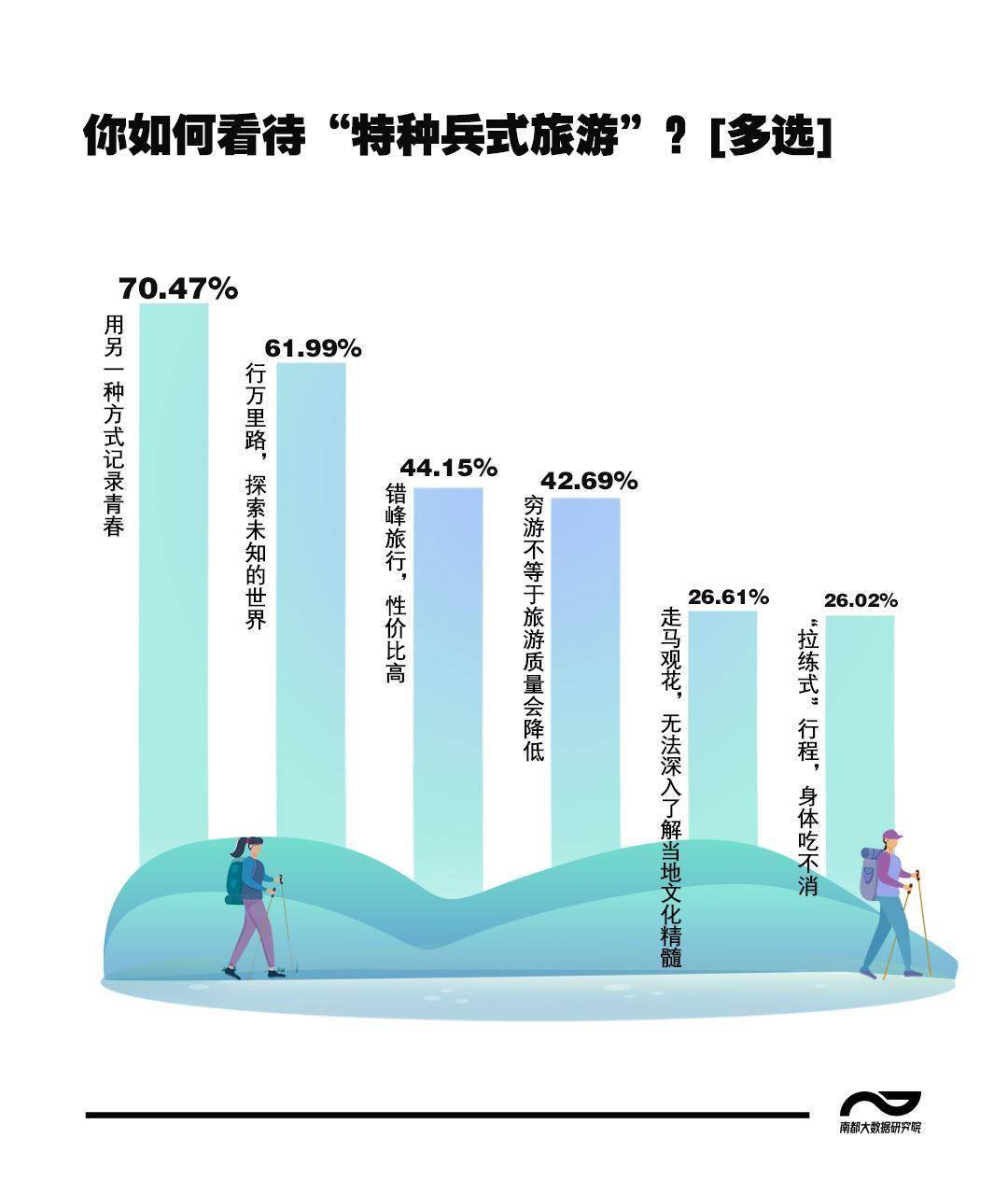 年轻人如何看待“特种兵式旅游”?全体受访青年中,70.47%认为“特种兵式旅游”是用另一种方式记录青春;61.99%认为“特种兵式旅游”意味着行万里路,探索未知的世界。