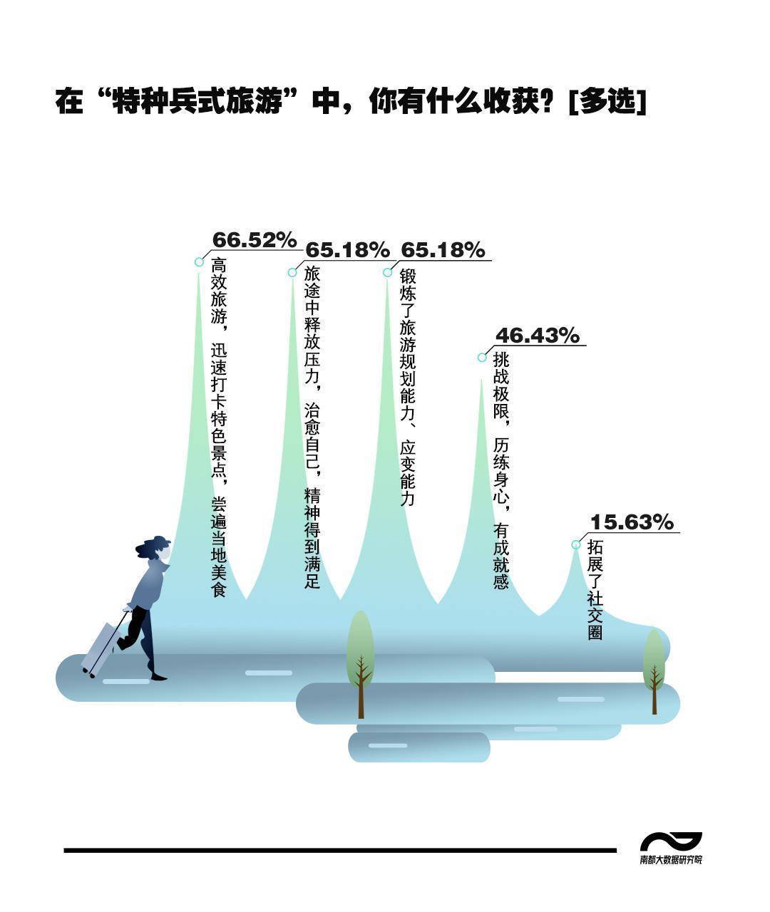 为何“特种兵式旅游”能在年轻群体中掀起潮流?大家在旅途中有哪些收获?本次调查发现,当过“旅游特种兵”的受访青年表示,“高效旅游,迅速打卡特色景点,尝遍当地美食”“旅途中释放压力,治愈自己,精神得到满足”“锻炼了旅游规划能力、应变能力”是主要收获,比例均超过65%。