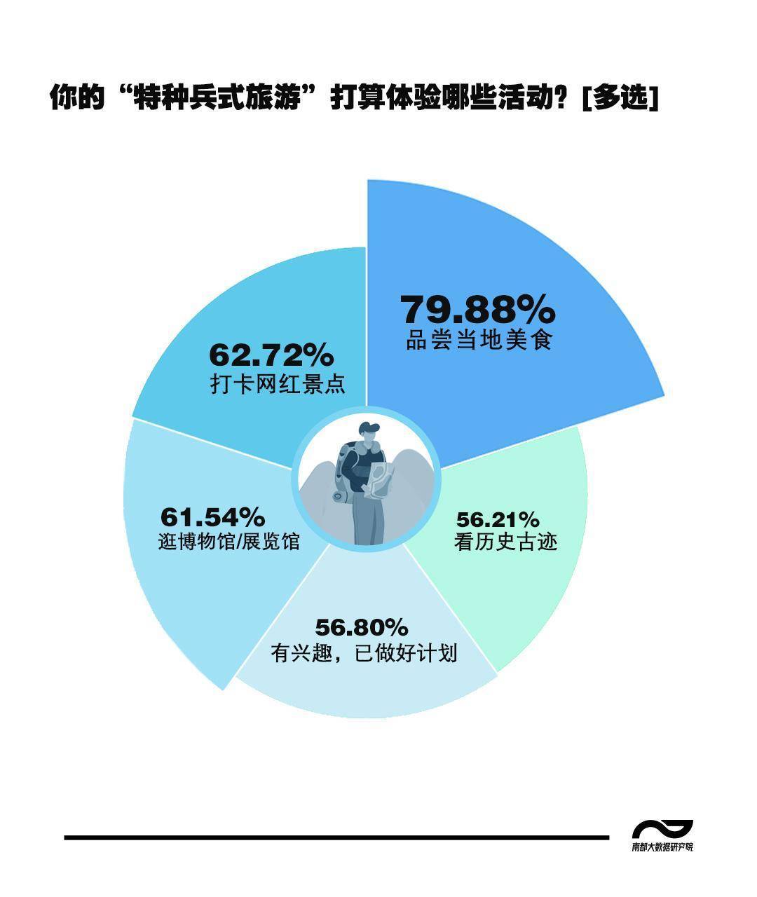 调查还发现,今年五一假期,有兴趣体验“特种兵式旅游”的受访青年中,广州、北京、长沙、深圳、重庆等旅游目的地较受欢迎,被提及次数较多。此外,79.88%的受访青年表示最想品尝当地美食。