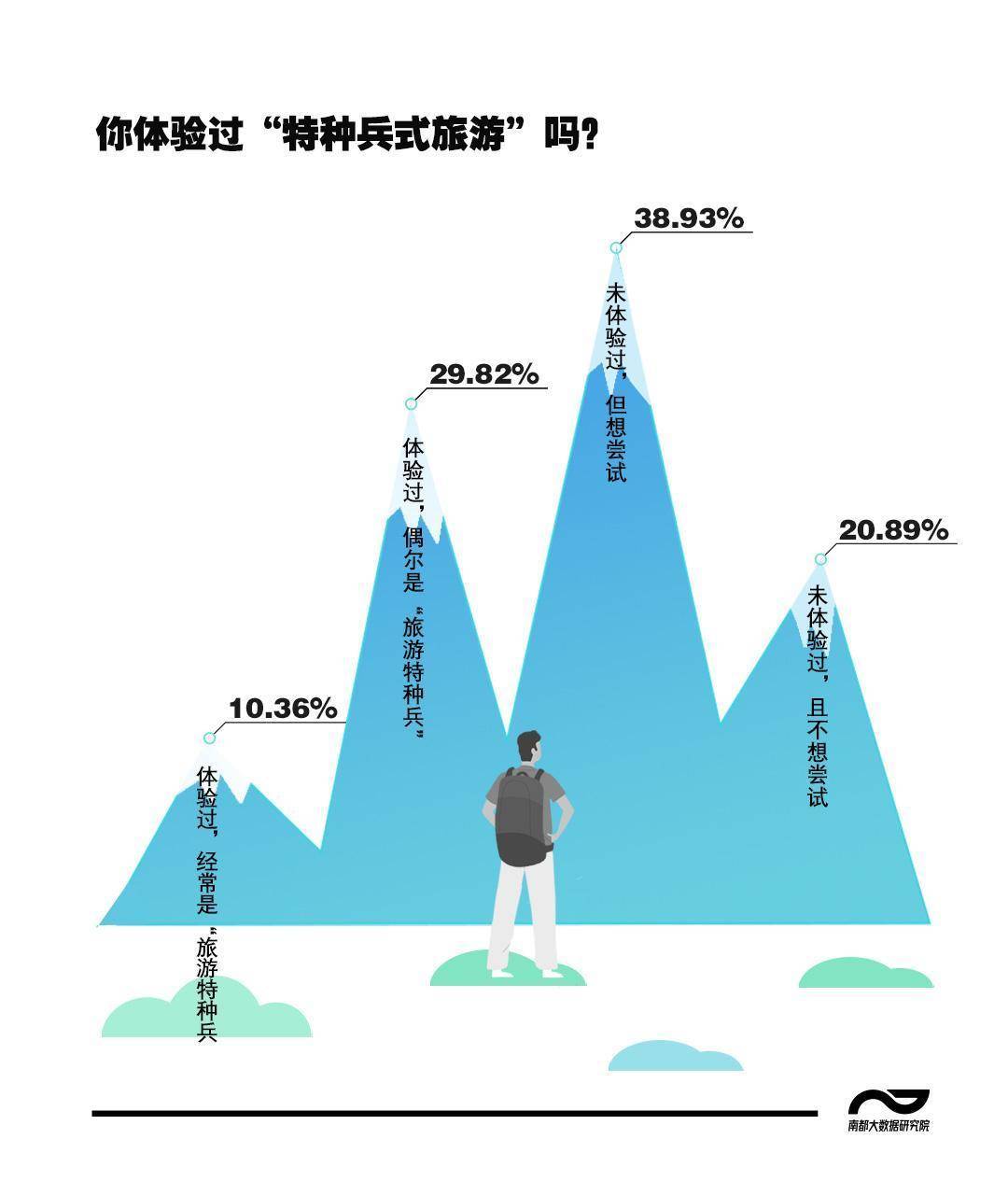 南都大数据研究院调查数据显示,82.86%的受访青年表示有留意到近期“特种兵式旅游”风靡年轻群体的现象。进一步了解发现,40.18%的受访青年表示当过“旅游特种兵”;38.93%表示未体验过但想尝试。从年龄段来看,95后、00后当过“旅游特种兵”的比例分别为43.15%、41.48%,均高于90后。